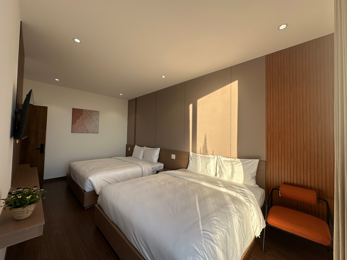 Lumi Room is inspired by Nordic design, featuring a clean white palette, bright open space, and refined minimalism. Sunlight streams through large glass windows, bathing the room in a soft glow reminiscent of a Northern winter. Warm wooden accents blend with crisp white tones to create a calm and airy atmosphere. A private balcony welcomes fresh air and Pleiku’s golden sunsets. An ideal retreat to rest, breathe deeply, and embrace serene simplicity.
