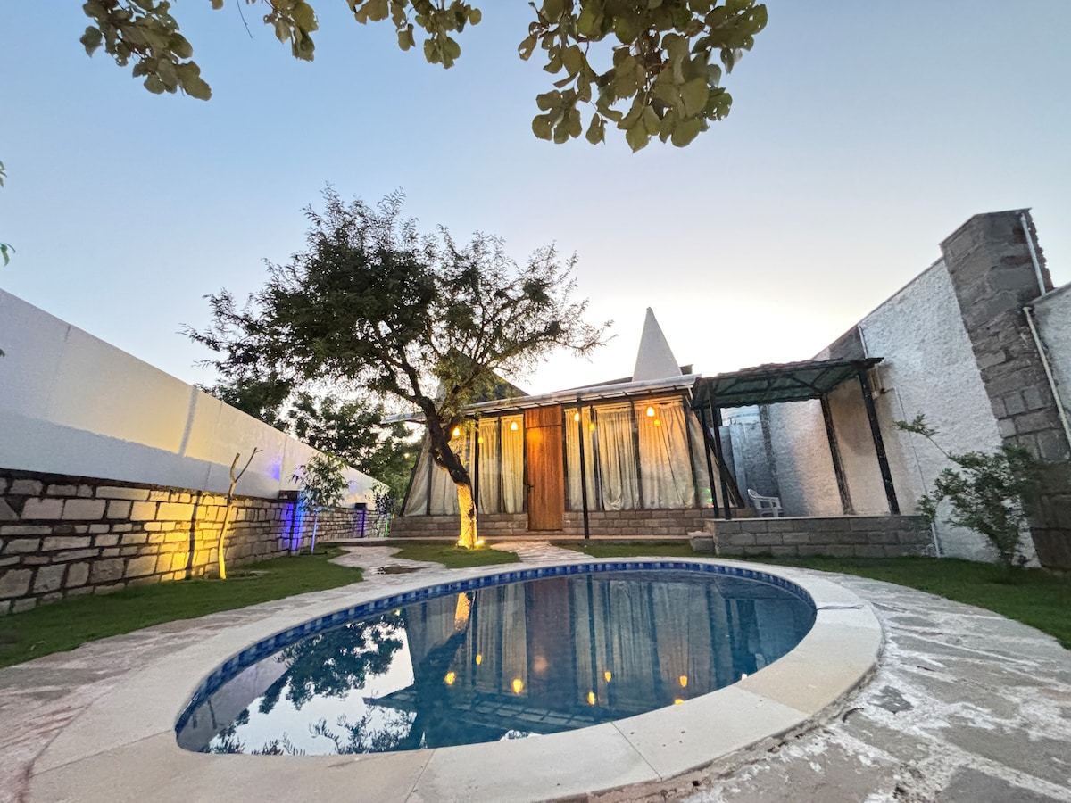 NeerVana Villa, Kota (A lakeside heaven of nature, bird songs & bliss) — A modern 3BHK farm stay set on 1,36,000 sq. ft. of pure tranquility. Glass-walled living, open kitchen, private pool, rose gardens & a 360° terrace view. Wake up to golden sunrises, unwind with sunsets, and spot cranes, foxes & blue bulls right from your window. Only 1 km from the serene Alniya Dam — where the wild meets the still.