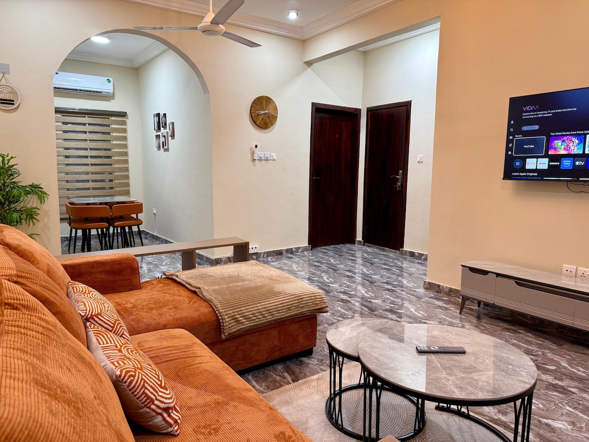 ¡Disfrutá de lo mejor de Acra en nuestro departamento acogedor y elegante! Nuestro espacio completamente amueblado cuenta con todas las comodidades que necesitás para una estadía cómoda. Ubicado en un barrio seguro y cómodo, estarás a solo unos minutos de las mejores playas y centros comerciales de la ciudad. ¡Reservá tu estadía hoy y hacé que tu viaje a Accra sea inolvidable! Relájate en este espacio tranquilo y elegante. Cerca de Spintex, el aeropuerto, Osu, Tema, East Legon, Cantonments, Labadi. Televisor grande de 75 pulgadas con YouTube, Netflix y películas
