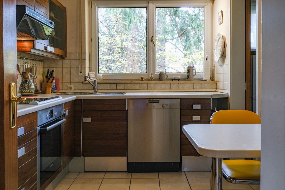 Idílico apartamento en la planta superior en una casa unifamiliar. Ubicado en las afueras de Múnich, a solo 20 minutos en auto de la ciudad. El apartamento limita con la propiedad con un bosque y un río cercanos para paseos relajantes. El apartamento ha sido recientemente completamente renovado y modernamente equipado. La máquina de café expreso y el wifi están disponibles de forma gratuita para los huéspedes. La nueva cama de somier te permite dormir como un sueño y la ventana panorámica ofrece una vista maravillosa del jardín.