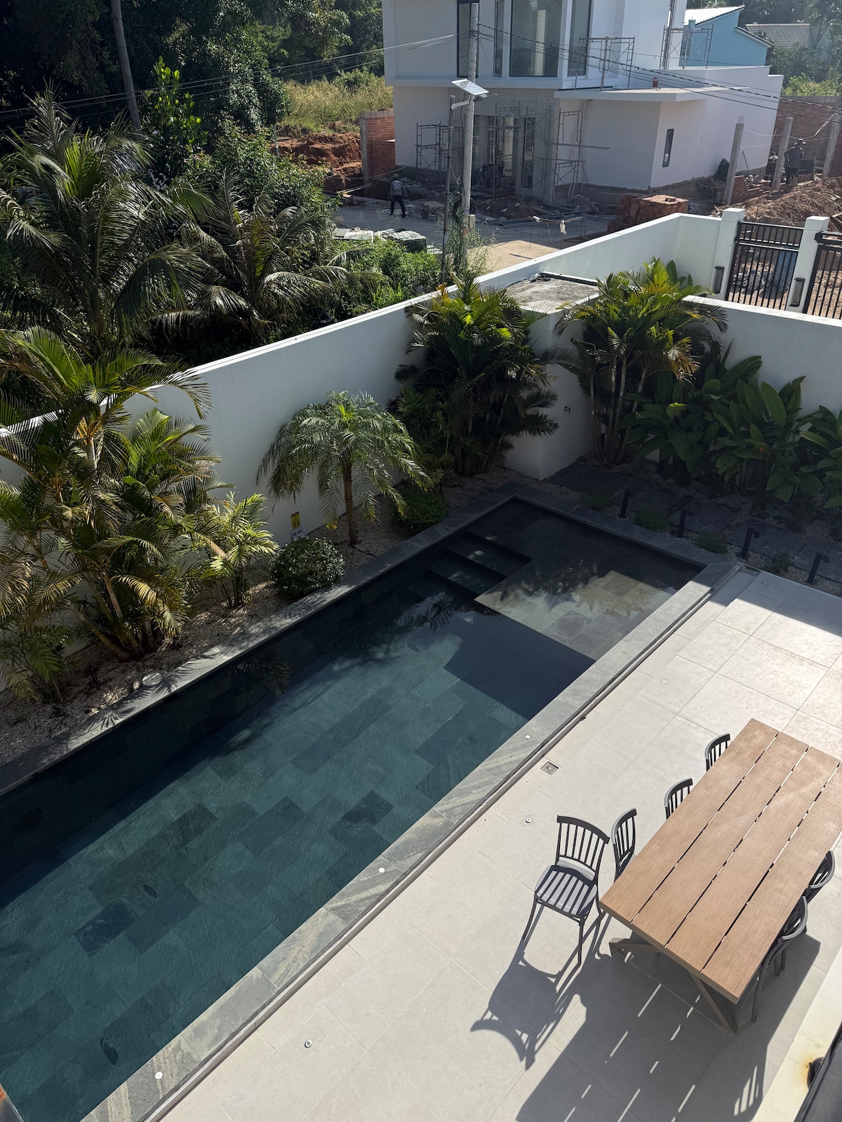 Lee Villa features elegant European-style architecture with an open layout, surrounded by lush greenery and colorful flowers. The front includes a salt-treated swimming pool and a private garage for easy car access. Inside, you’ll find a stylish living room, a fully equipped kitchen and bar, and a bright central area lit by a skylight. The villa offers 2 double bedrooms and 1 twin room. it’s perfect for families, friends, or professionals seeking a quiet and refreshing retreat.