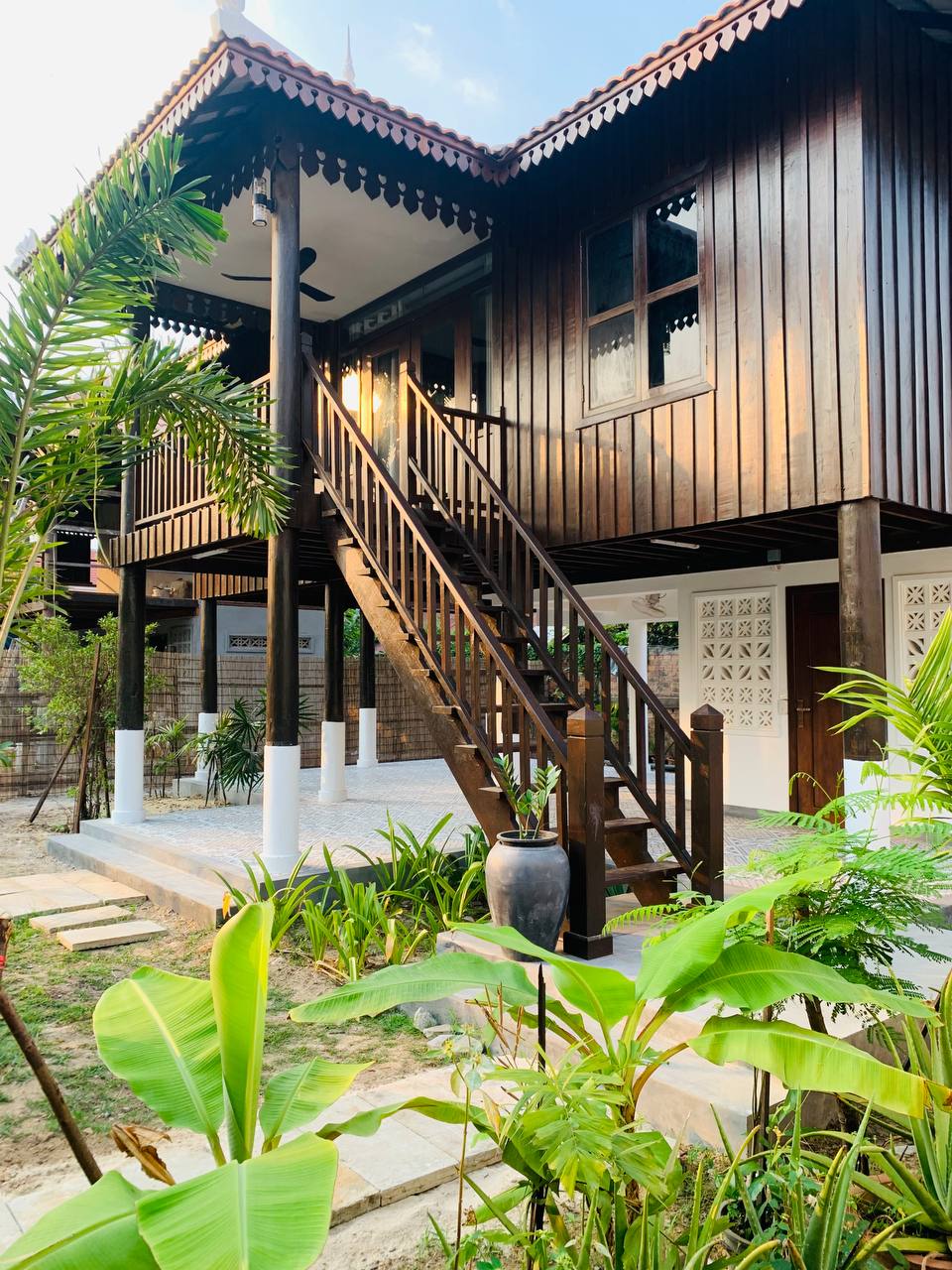 Roya Khmer House es una magnífica casa tradicional jemer. Mantenemos que todos los formatos externos siguen siendo los mismos en los últimos 100 años que la casa de madera jemer. Mi esposo y yo hemos visto el potencial y el valor de la madera antigua, así que decidimos comprar una antigua casa de madera del campo abandonada y ya no la necesitaba del propietario. Parte de la madera estaba completamente dañada, pero parte de la madera todavía se usa y decora para la hermosa casa. La casa está rodeada de vistas al jardín.