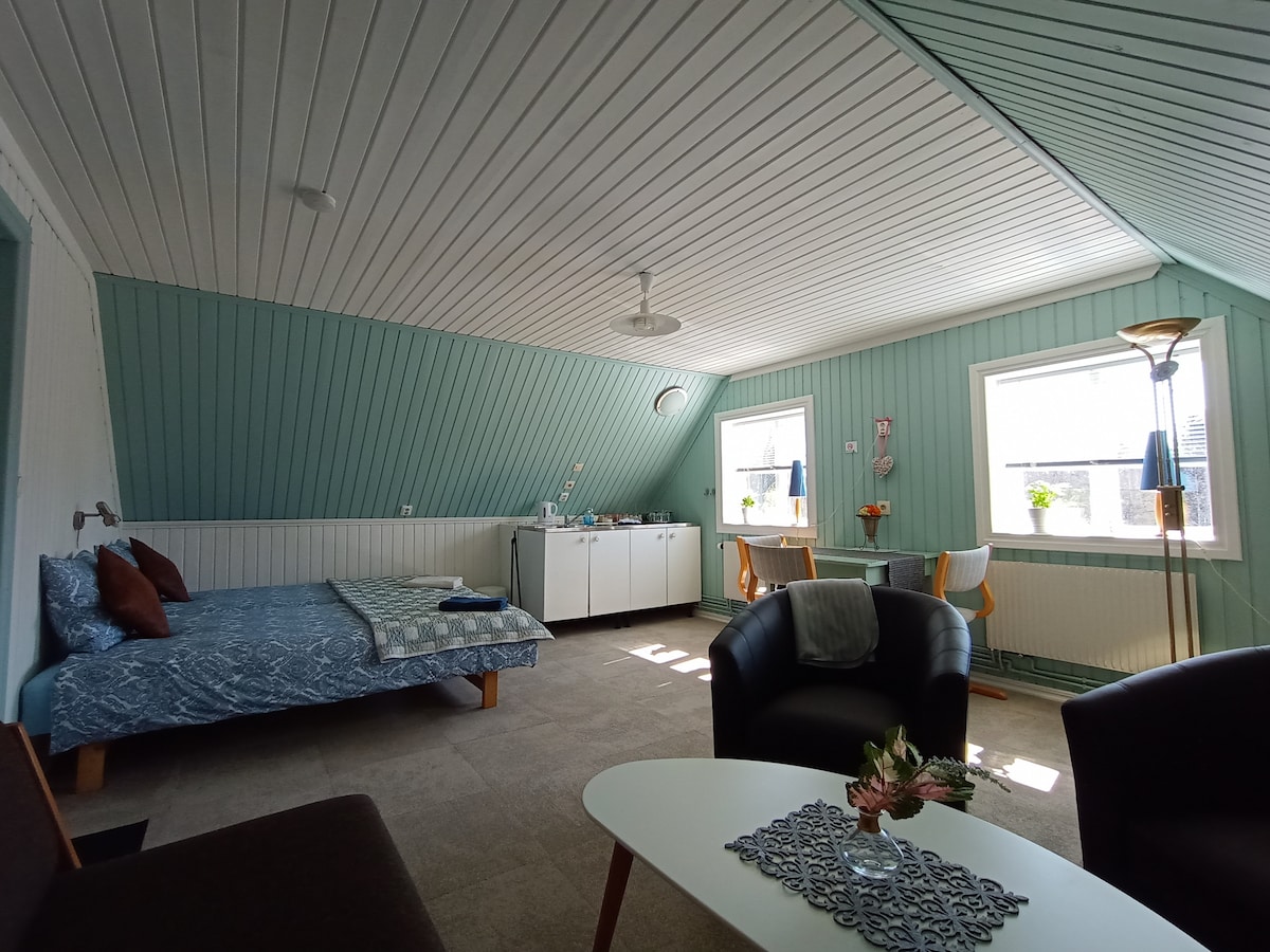 Bienvenido a nuestro último apartamento/estudio, listo en 2017. El estudio tiene unos 50 m2 o 538 pies cuadrados, distribuidos en una habitación con una cama tamaño king, una sala de estar/comedor combinada, un baño y una cocina. El estudio está en un estilo rural tradicional sueco y totalmente equipado. El estudio está ubicado en nuestro edificio principal, una casa señorial de la década de 1850. Vivirás en medio de una reserva natural con un hermoso bosque de hayas, praderas y pastos con animales de pastoreo y proximidad al lago Möckeln.