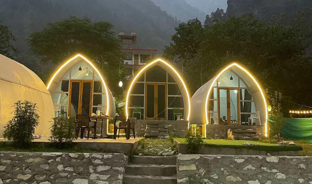 Luxury Camps in Raison: Wake up to epic Himalayan views, unwind under a canopy of stars, & relax in style. ️ 10 spacious tents w/ comfy beds & modern bathrooms. Adventure awaits: paragliding, rafting, & hidden gem exploration. Cozy bonfires, personalized service, & epic mountain memories. Escape the ordinary. Book your unforgettable glamping adventure today!