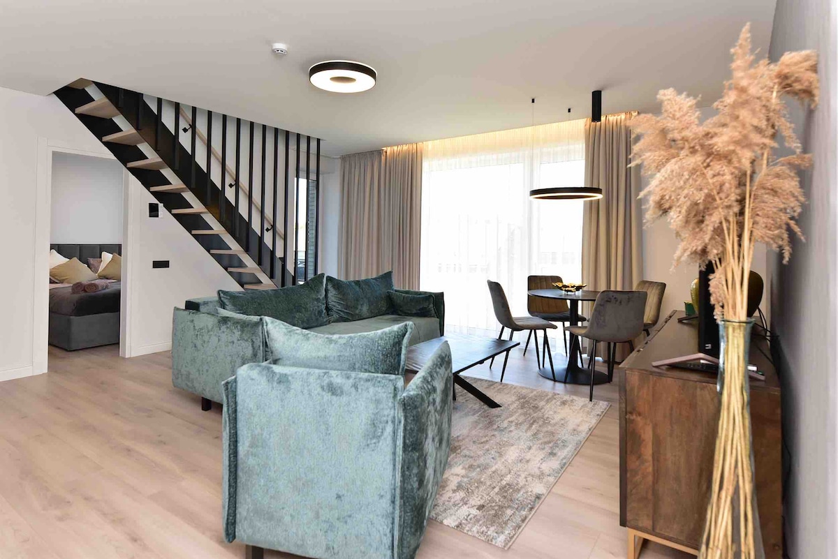 Apartamento en la residencia «Hill Garden». Al amueblar el apartamento, una de las principales consideraciones que tuvimos fue combinar funcionalidad y estilo. El lugar es ideal tanto para una pareja como para una familia, con un dormitorio separado y un sofá cama en la sala de estar que se prepara en solo unos segundos; nos sorprendió lo fácil que es plegarlo y desplegarlo. ¡Estamos deseando darte la bienvenida a Kunigiskes y estamos convencidos de que estarás deseando volver!