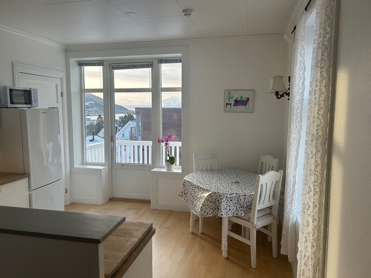 Departamento práctico y agradable de unos 40 m2, con cocina, mesa de comedor para 4, fantásticas vistas de la entrada a Tromsø, la Catedral Ártica y el Puente de Tromsø, sillas y mesas afuera donde se puede disfrutar del sol de medianoche desde finales de mayo hasta finales de julio o de las auroras boreales en el período de septiembre a abril Cerca de la parada de autobús, supermercado, restaurante), a 20 minutos a pie del centro de la ciudad. Hay muchas rutas de senderismo agradables cerca. Estacionamiento gratuito, pero debe ser acordado, te recomendamos que alquiles un auto con tracción en las 4 ruedas en invierno, para que puedas llegar a la casa