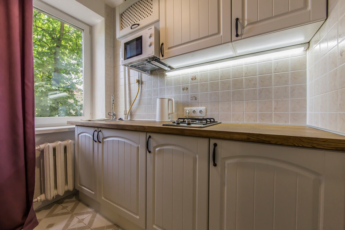 Nos complace presentarle un hermoso estudio tipo hotel en un edificio histórico, construido en 1905 año, ubicado en el centro histórico de la ciudad y está en la lista de monumentos arquitectónicos. Ofrecemos a nuestros huéspedes unas vacaciones en apartamentos nuevos, después de la renovación, con techos altos y un patio tranquilo. Sala de estar bien diseñada con una cama grande, un mini gatito compacto equipado. El diseño está creado para su comodidad y calidad. TV ELED-Smart de 43 pulgadas con TV por cable, Internet, WIFI