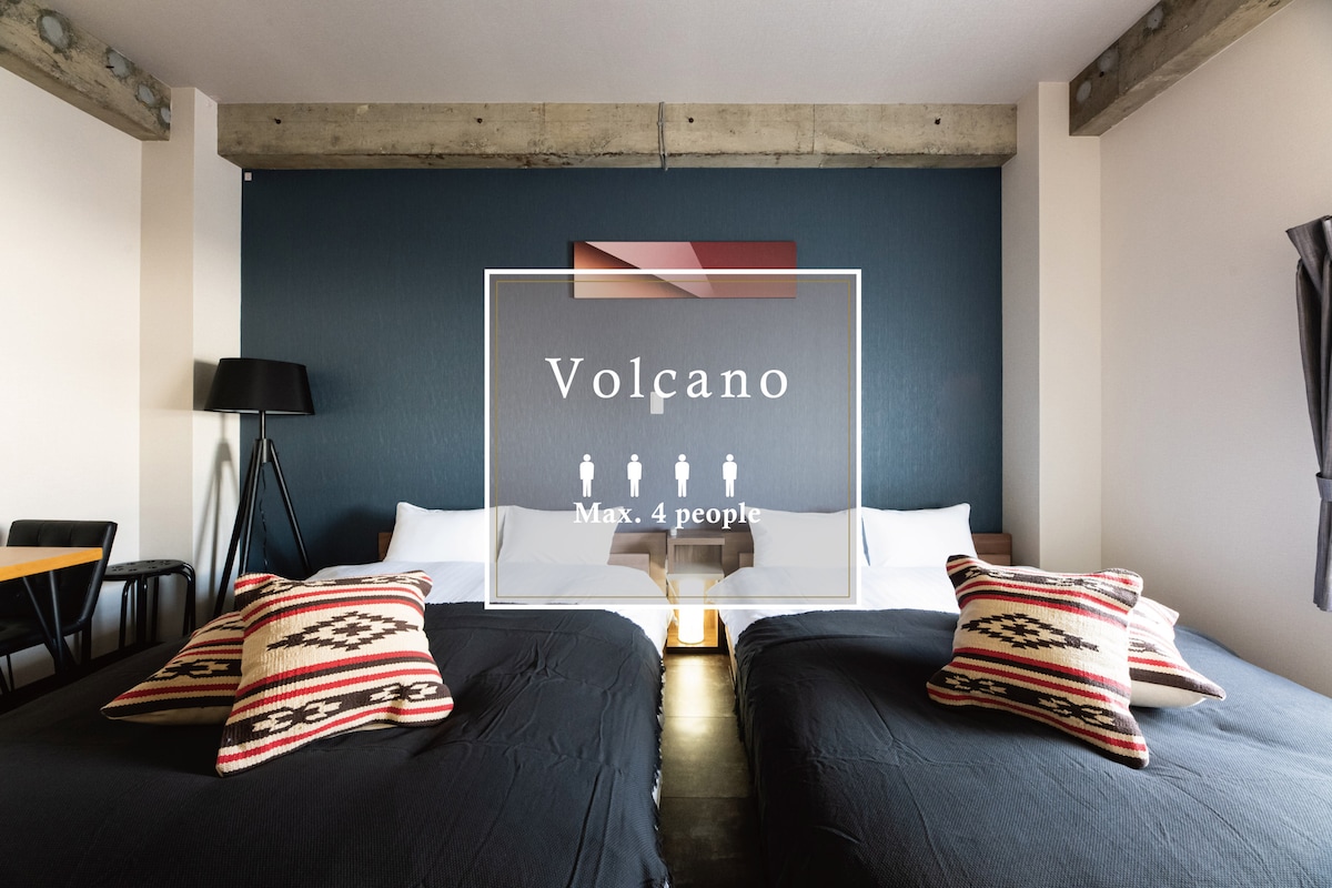 【Volcano】ベーシックツインルーム ダブルベッド2台 キッチン洗濯機付 禁煙