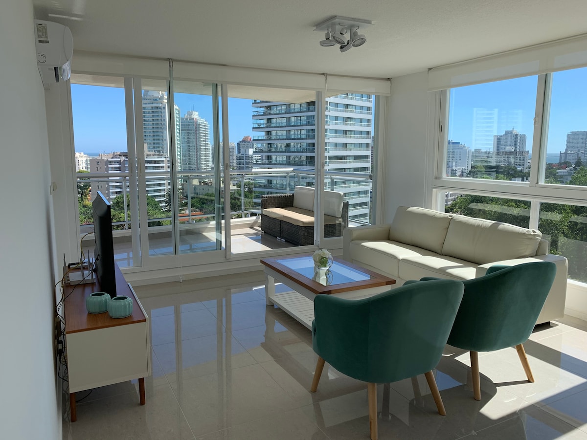 Hermoso apartamento nuevo en espectacular zona, sobre playa Mansa. Sombrilla y reposeras a tu disposición como huésped. Excelente condominio con piscinas climatizadas, play room, gym, solarium, barbacoa, laundry, cochera para 2 autos. Amplios espacios abiertos enjardinados y parquizados. Lugar tranquilo para descansar y relajarse. A 10 minutos de la península. Apto. un dormitorio, Aire Acondicionado, baño columna hidro, living comedor, cocina integrada, isla, amplia terraza. Bienvenidos.