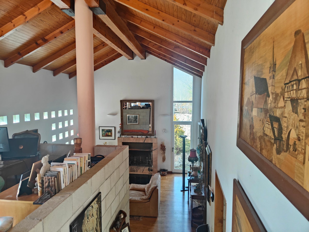 Una casa luminosa con una vista espectacular del monte Canigou. Decorada con colores, esta moderna casa está diseñada para la vida verde. Grandes ventanales con vistas a los cerezos y los manzanos en el jardín. Una estufa de leña mantiene la casa caliente durante los días de invierno sin nubes. La moderna cocina está totalmente equipada, incluida una cocina de hierro fundido. La entreplanta ofrece un rincón acogedor con TV y paredes llenas de libros. Espacio de trabajo en esquina en la sala de estar. Cada habitación está decorada con un tema individual único.
