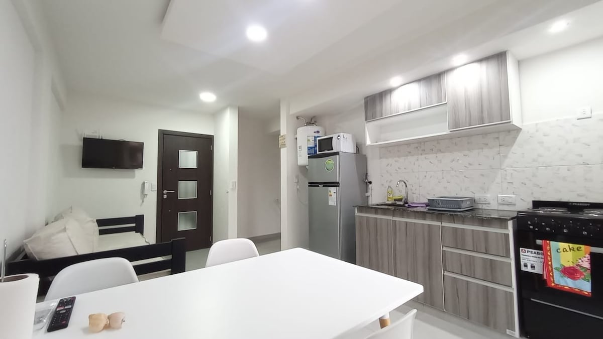 Departamento para 4 personas totalmente a estrenar en excelente ubicación, a tan solo 200 m del Mar, a 100 de Chiozza y a 200 m de Av. San Bernardo ( Zona de variada gastronomía) cuenta con: * Tv en living comedor. * Aire acondicionado en living comedor. * Wifi / tv por cable. * Microondas, tostadora, licuadora, etc (no incluye sábanas)