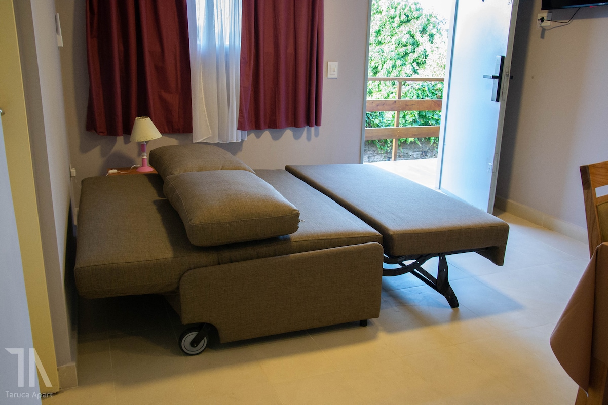 Acogedor departamento, con comodidad para 2, 3 y 4 personas, el mismo cuenta con una cama matrimonial y con un diván (sillón) que se hace cama, las sábanas son de algodón de primera calidad. El departamento cuenta con aire acondicionado frio-calor, muy buena señal de wifi, para poder estudiar o trabajar y hacer video llamadas sin problema, Tv 32", Cocina amplia, equipada con heladera, microondas, cocina/horno, para que los huéspedes puedan cocinar, pava eléctrica y vajilla de cocina.