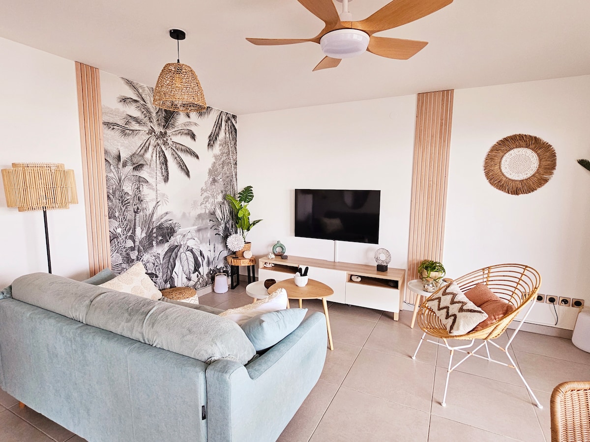 Le damos la bienvenida a nuestro moderno y luminoso T3 «Tamarin», idealmente situado en La Saline-les-Bains en una calle tranquila y confidencial Diseñado para 4 personas, ofrece 2 habitaciones con aire acondicionado y cómodas camas de 200/160 y mucho espacio de almacenamiento Amplio salón con sofá, TV y zona de comedor Cocina totalmente equipada. Amplia terraza con vistas al mar sin vis-à-vis Baño moderno con ducha a ras de suelo Sábanas y toallas Fiestas y animales no permitidos