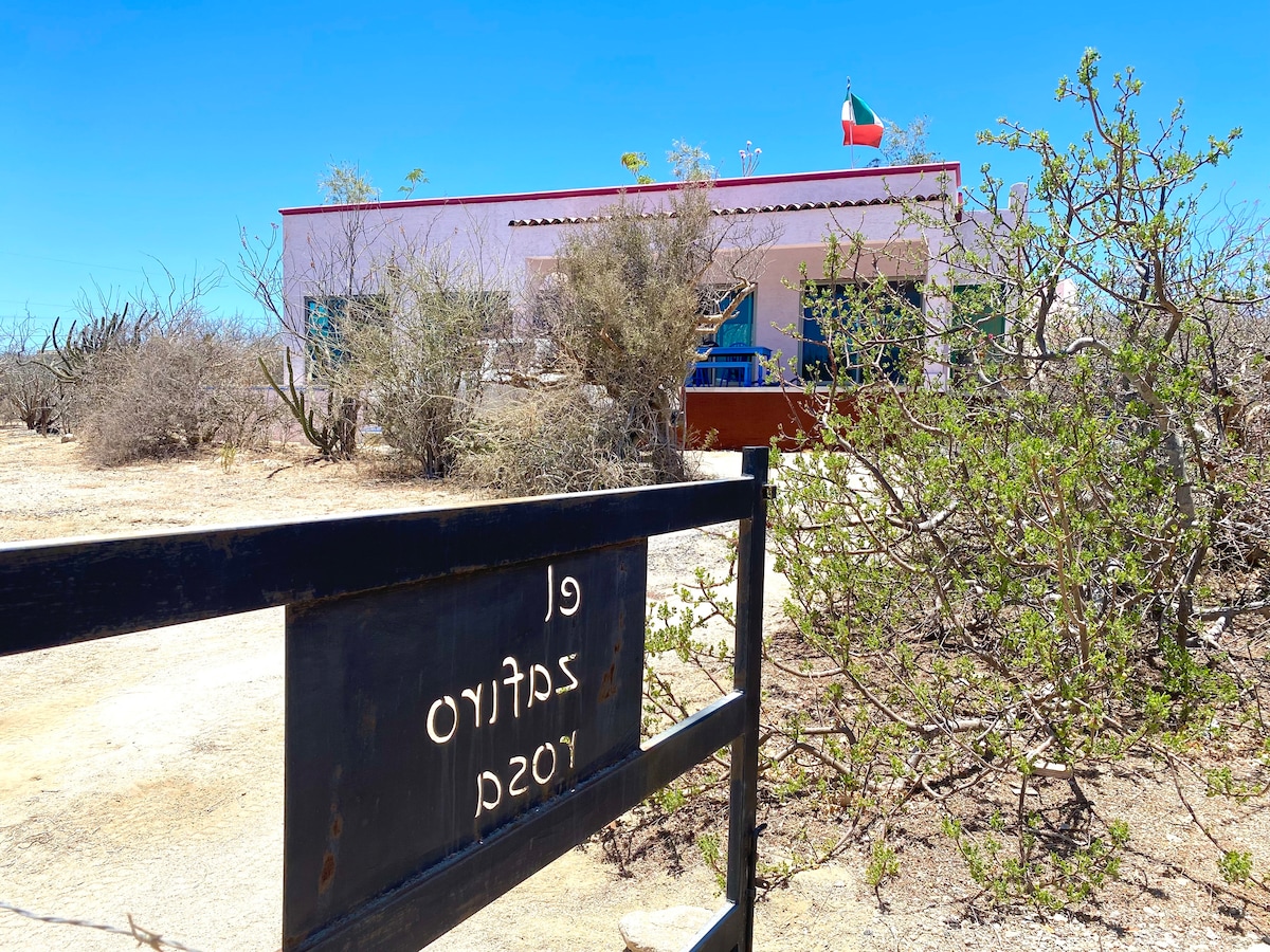 Casita Nopal is a cozy, private retreat blending modern comfort with local charm. It features two bedrooms: a master with a posturepedic king bed and premium linens, and a second with two single beds. The fully equipped kitchen includes a coffee bar and Talavera glassware. Relax in the living area with AC, Netflix, and more. Enjoy the rooftop patio with an outdoor kitchen, BBQ, and fire pit. Ideal for exploring Bahía de La Ventana, this casita is your perfect getaway. 15 minute walk to the beach