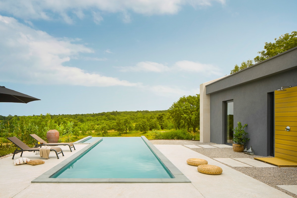 Stylish villa near Rovinj with picture worthy pool, sunk in hot tub, sauna. Wake up to lush, panoramic valley views. Couples and family-friendly, a short drive to adventure park, Brijuni National Park, dinopark, medieval towns & local cuisine. It is a true green escape for anyone looking to get back to nature with all the comfort of modern living. Fully equipped for cooking and entertainment in 2600 m2 of garden (football, speed ball, badminton & pool fun) for your kids and loved ones to enjoy.