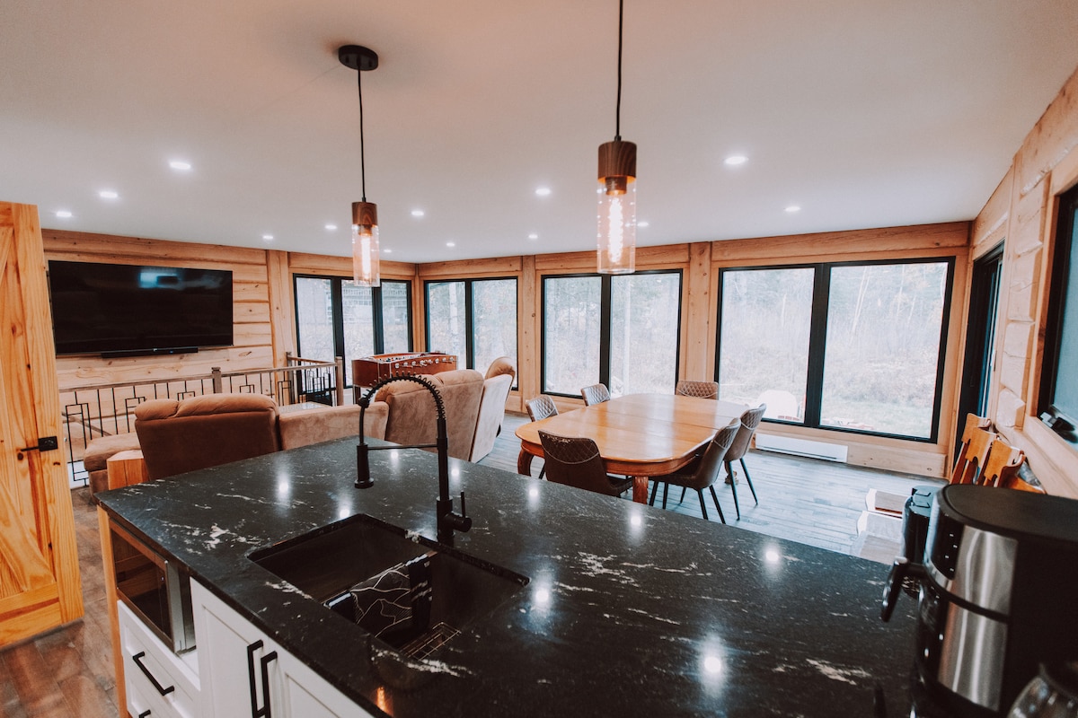 Escape to a new luxury waterfront chalet on the L’Assomption River. This 3,200 sq ft home offers stunning mountain views, an 8-person hot tub, and game room. Comfortably sleeping 9 guests, it's the perfect intimate retreat just 1 hour from Montreal and minutes from skiing. Enjoy superior quality, handcrafted details, and direct river access for an unforgettable stay.
