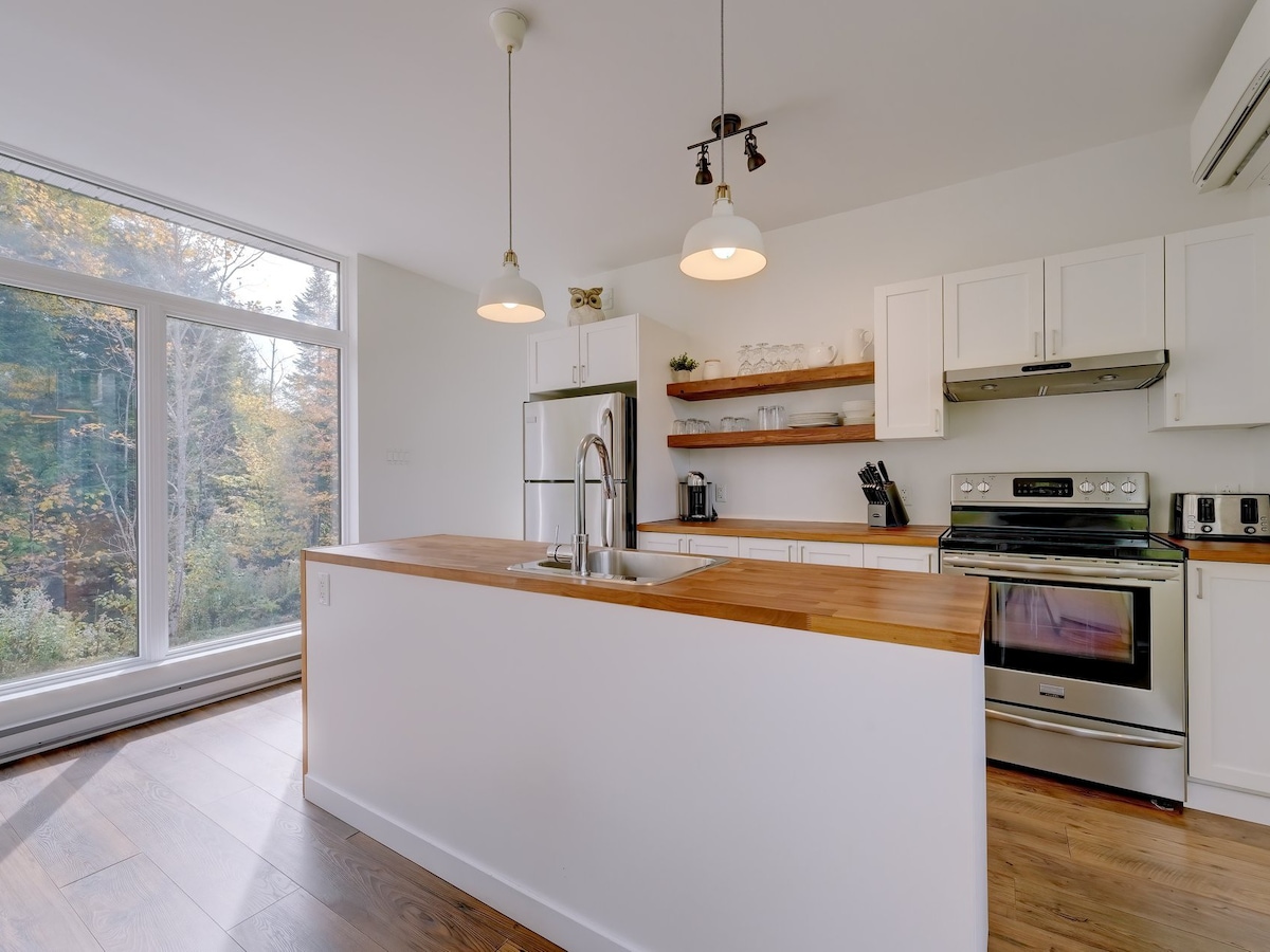 Monumental open concept, in the heart of nature. Access to trails directly behind the house. Wood stove, large modern bathroom, one bedroom + sofa bed. Another sofa bed in the living room. Ideal chalet for a couple with children or two couples. Wild birds, turkey, and deer lovers welcome! Wifi and EV charger included. Dogs Welcome! CITQ : #308038