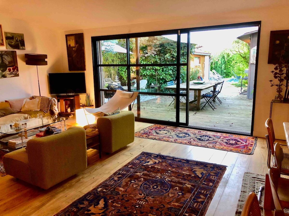 “Aquí, cada objeto tiene una historia. Y tal vez encuentres el tuyo. Casa de una sola planta en Bouscat de 130 m2. 2 dormitorios con baño, inodoros independientes + suite principal con baño (ducha a ras de suelo) e inodoro. Gran sala de estar con aire acondicionado reversible y cocina abierta con vistas a 1 amplia terraza arbolada y equipada con muebles de relajación . Pequeña pileta de agua salada climatizada de 4/5 m equipada con una playa. Cocina de verano equipada con plancha eléctrica