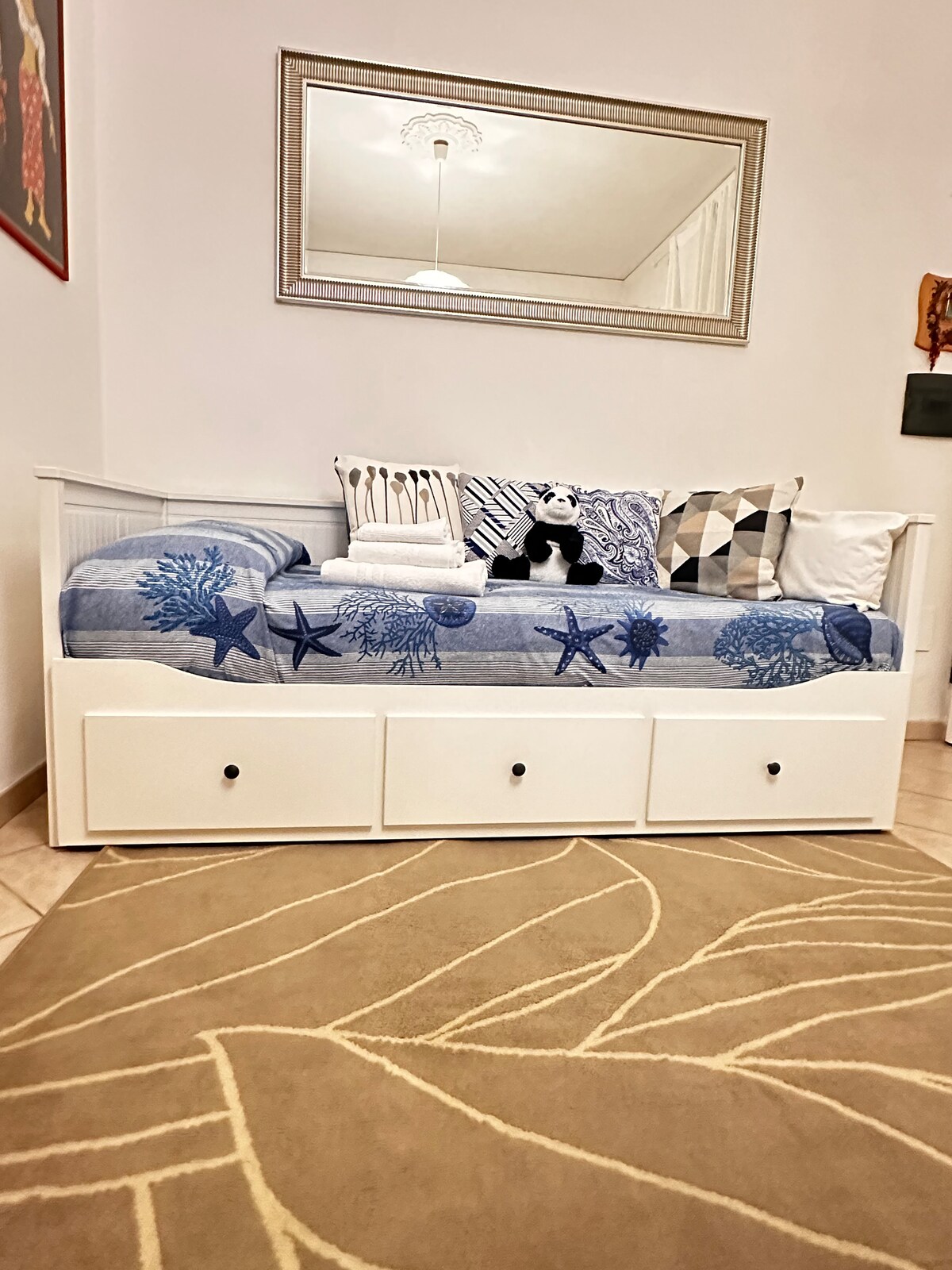 El apartamento se encuentra a 5 minutos (450 m) a pie del mar, a 2 minutos (170 m) del centro de la ciudad y a 10 minutos (750 m) de la estación de Ladispoli-Cerveteri. Frente al apartamento hay un supermercado y el mercado diario de alimentos. El edificio es nuevo, cómodo y está totalmente climatizado. También cuenta con calefacción independiente, lavadora, lavavajillas, televisión, microondas, plancha con tabla, secador de pelo, calentador de agua y tendedero exterior.