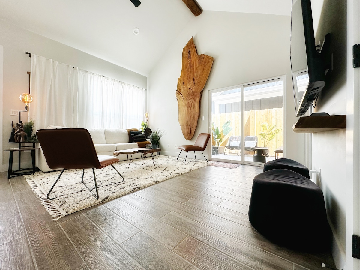 Aquí tienes el RESUMEN: - PASEO RÁPIDO a la CALLE PRINCIPAL - Dos plazas de aparcamiento JUSTO FUERA. - Hora de dormir = Hora de relajarse. - Dormitorio con colchón tamaño king Serta i-Series y TV de 55 pulgadas. - Amplia sala de estar con TV 4K de 70 pulgadas, consola ATARI y sofá cama tamaño king. - ¡Inicia sesión en TUS servicios de STREAMING! - Rincón interior con césped y hamaca (¡relájate!) - 2 espacios de patio privado (¡sí, dos!) con FOGATA de gas. - Diana y juegos. - Ropa de cama de ALGODÓN. - NUEVO apartamento de UN SOLO NIVEL. - Cocina EQUIPADA. - Comedor + mesa de bistró, ¡doble como oficina e isla!