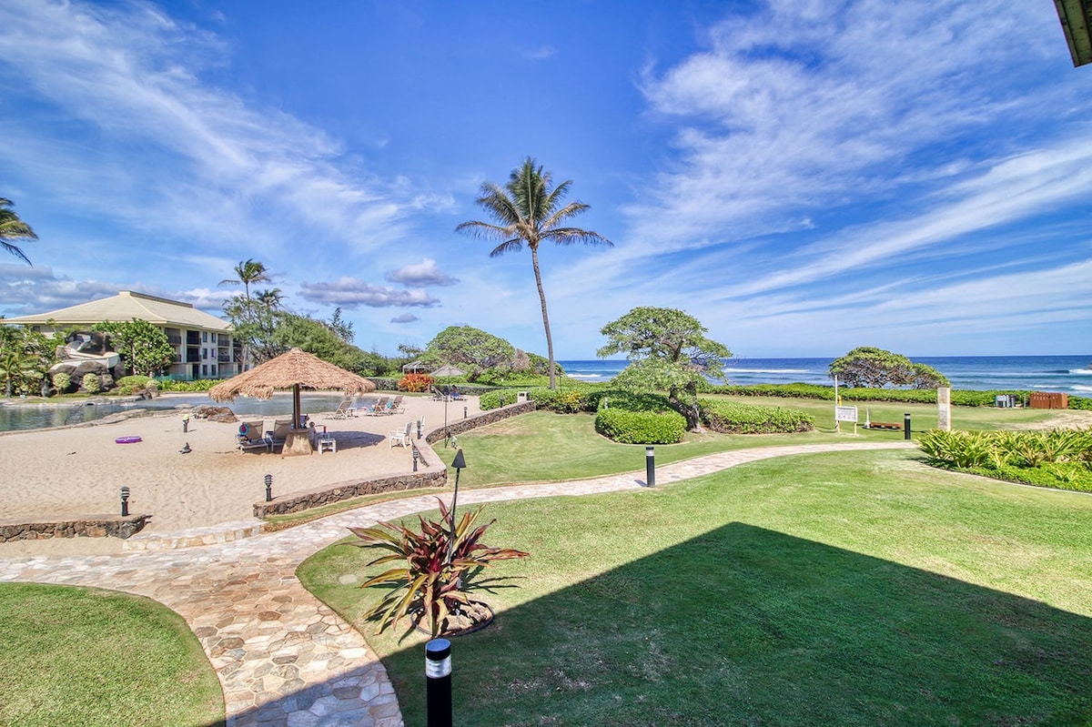This ground-floor beach resort condo is the perfect tropical getaway for a memorable vacation. Grab a cold drink, head out to the private lanai, and in the lush Hawaiian gardens with tropical birds and rhythmic rocking of the Pacific’s rolling waves. Your private lanai is furnished with a dining set to feast al fresco. In just a few steps, you will reach the shore to dip your toes in the soft sands of the turquoise ocean. Even more, you may spot sea life such as turtles or sea lions in action.