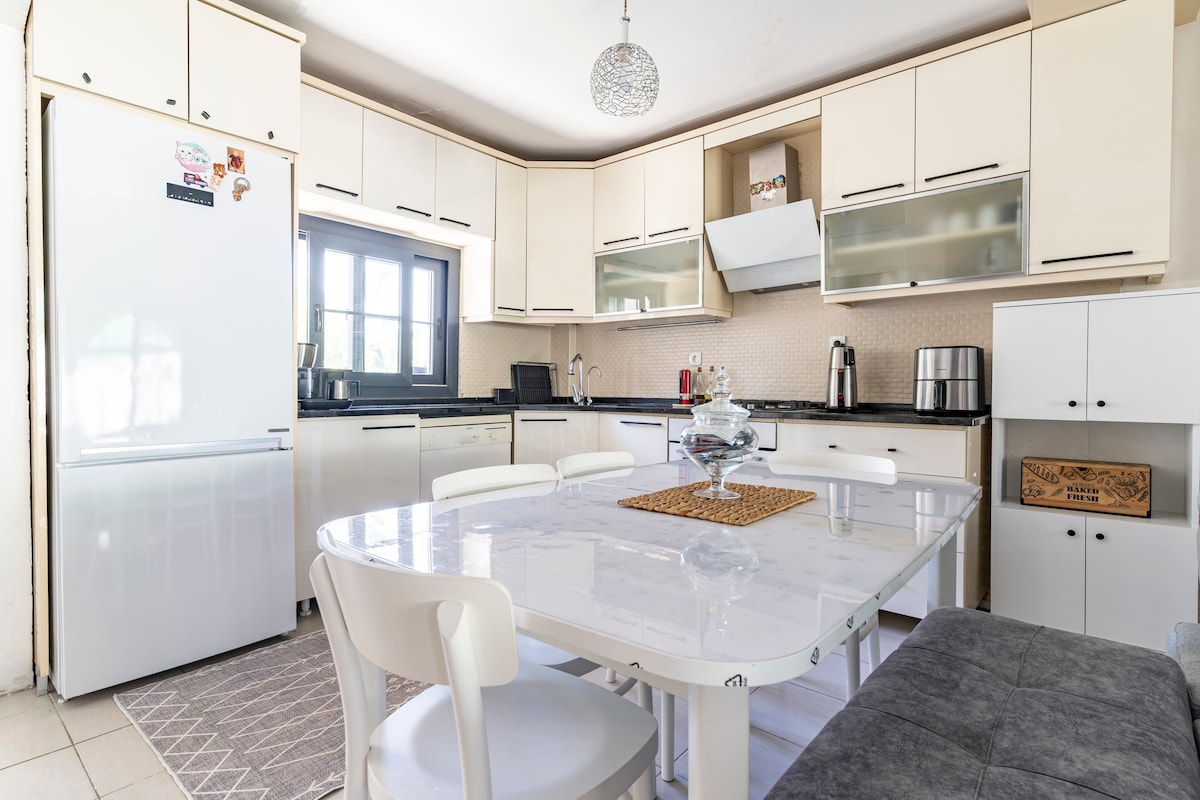 Está a 2-3 minutos en coche del mar de Ilica y del bazar de Alaçatı en términos de ubicación. 4 personas pueden usar fácilmente el jacuzzi en el jardín. Nuestra casa es una casa limpia, segura y pacífica donde puedes alojarte con tu familia y amigos. Nuestra casa tiene todo lo que necesitas. Nuestra casa tiene dormitorios en la planta superior, baño grande y aseo en la planta baja, y hay cocina, salón, baño y aseo. Hay aire acondicionado en cada habitación y sala de estar.