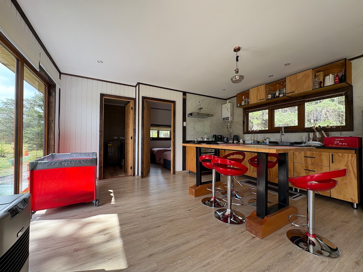 Hermosa cabaña -Martín Pescador- de madera tejuela de 55 mts2 con 2 habitaciones, una con cama matrimonial de 2 plazas y otra con cama plaza y media más cama nido de una plaza. Calefacción con radiador eléctrico y adicional calefacción a Pellet central. Amplio baño con lavadora incluida. Cocina equipada y Frigobar. Excelente construcción con aislación térmica, piso de madera y todos los ventanales en Termopanel. Opción de un excelente desayuno por $7.500 pesos chilenos p/p.