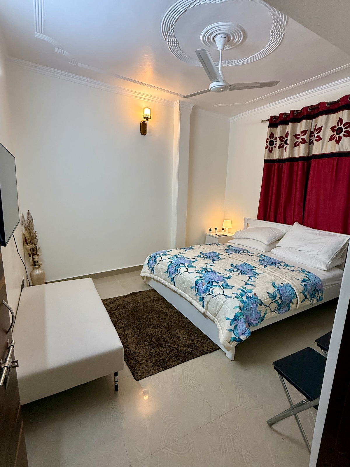 Nuestros apartamentos están totalmente higienizados y 100% libres del virus Corona/ COVID-19. Usamos desinfectantes alcohólicos después de cada salida de huéspedes. Es un apartamento independiente, privado y tranquilo de 1 dormitorio con ascensor, situado en una sociedad cerrada en Lajpat Nagar 4 Area, en una zona elegante de Delhi del Sur. 1 dormitorio, 1 baño adjunto, una cocina totalmente equipada y un balcón. El apartamento tiene una Smart TV con Wifi y aire acondicionado completo. La cocina está totalmente equipada con todas las comodidades, utensilios y cubiertos.