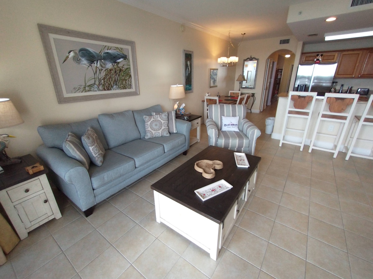 Escápate a nuestro impresionante condominio del piso 20 en Blue Heron Beach Resort, ¡te esperan impresionantes vistas al lago! Este espacioso refugio de 2 dormitorios y 2 baños tiene capacidad para alojar cómodamente hasta 6 huéspedes, por lo que es perfecto para familias. Disfruta de nuestra cocina totalmente equipada y de una acogedora sala de estar que invita a la relajación. A solo 10 minutos de Disney y otros parques temáticos, ¡estás en el corazón de la acción! Relájate junto a la piscina o sumérgete en las tranquilas puestas de sol desde tu balcón privado. ¡Tu escapada inolvidable comienza aquí!