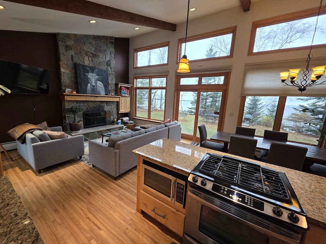 Relax with expansive views of Lake Superior as you bask in the glow of the wood burning fireplace's radiance. Waves echoing off the brownstone cliff upon which this special home is perched, absorb the splendor of bald eagles soaring only feet away. Minutes from your nest is Meyer's Beach, the common entry point to begin your kayak or hiking excursion to the sea and ice caves of this, the greatest of all lakes. Bike, hiking, motorsports and XC ski trails abound. Rest or play. It's all here.