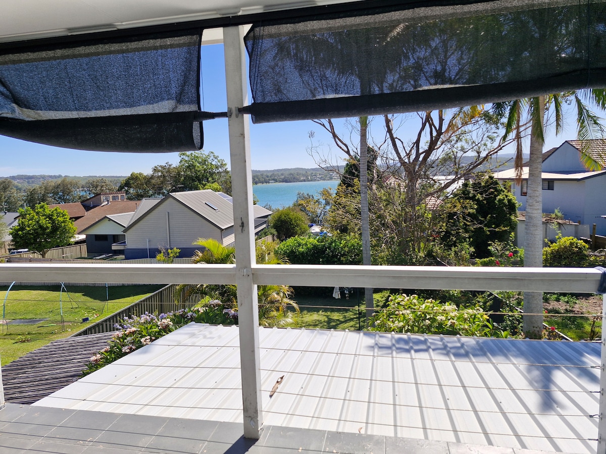 Ubicado en la colina en un suburbio junto al lago del este del lago Macquarie, Newcastle, en el centro del lago Macquarie y Newcastle, a 15 minutos del final de la M1 (salida de Swansea), vistas al lago y a pocos minutos a pie del lago o Bush Tracks. Casa modernizada en el lado de la colina, rampa de entrada de nivel plano hasta la puerta principal. Dormitorio principal, baño privado con vistas al lago. Disfruta de esta casa de nivel dividido, 3 salas de estar, comedor y cocina con balcón y mesa de barbacoa Weber al aire libre para cenar junto al árbol y vistas al lago.