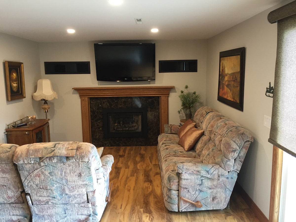 New studio apartment with separate entrance. Fully furnished kitchen, new Queen sized bed, all new furnishings including desk area, Wi-Fi, lots of storage space, new refrigerator, stove, microwave, 42" TV, and dishwasher. Unit includes your own washer and dryer and has a gorgeous lake view in front. Located close to movie theaters, bowling, restaurants, shopping malls, grocery stores, large state recreational park, skiing and convenient to airports. Bathroom inside unit with 2 recliner chairs