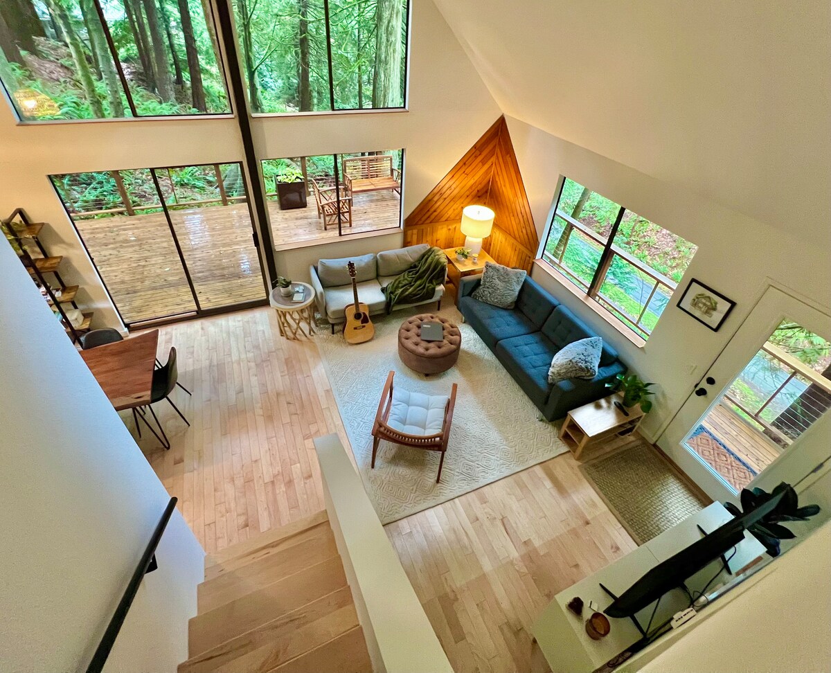 Steal away to the enchanted treehouse of your childhood dreams. With floor-to-ceiling windows framing views of pristine Pacific Northwest wilderness, this A-frame sanctuary offers the perfect combination of quiet seclusion and modern convenience. Note: the property features a significant (about 60) stair steps to climb. As a result, it may be more challenging to enjoy for those experiencing ambulatory limitations.