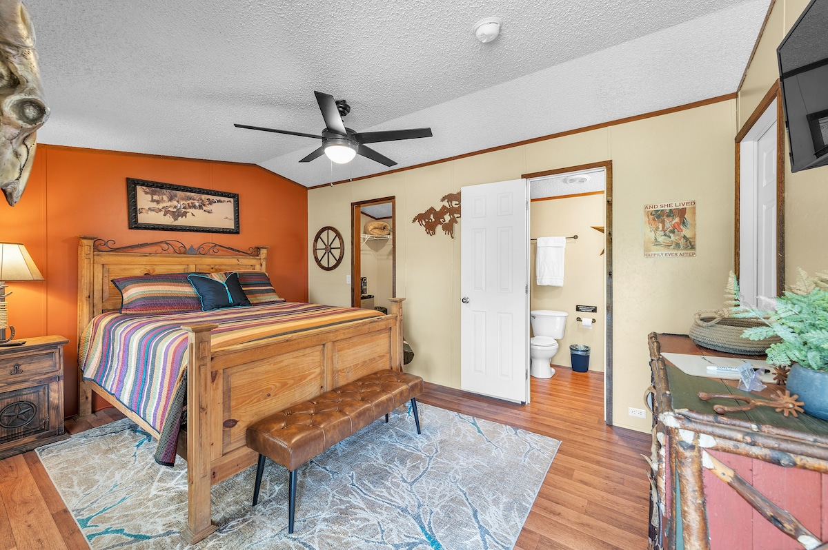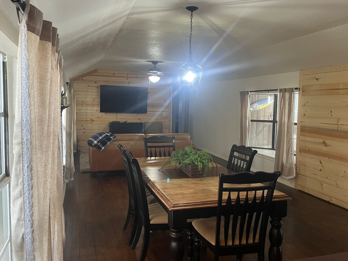 Casa entera (más de 2.100 pies cuadrados). Los huéspedes dicen que es más bonita que en las fotos y más cómoda que un hotel. Superlimpio: 3 baños completos, 3 dormitorios. Capacidad para 8 personas fácilmente, techos altos. Habitación familiar grande (35'x18'). Cocina: totalmente abastecida. Oficina, lavadero. Televisores en todos los dormitorios, TV de 65 pulgadas de ancho, antena parabólica y películas en streaming. Fogata con leña. Prado de 3 acres privado con vistas al cielo. Patios de juego vallados. Parrilla de carbón. Circuito para barcos, plataforma para autocaravanas, fácil acceso desde la autopista 70. A 1,5 millas del lago Texoma, a 10 millas del casino Choctaw. Se admiten perros.