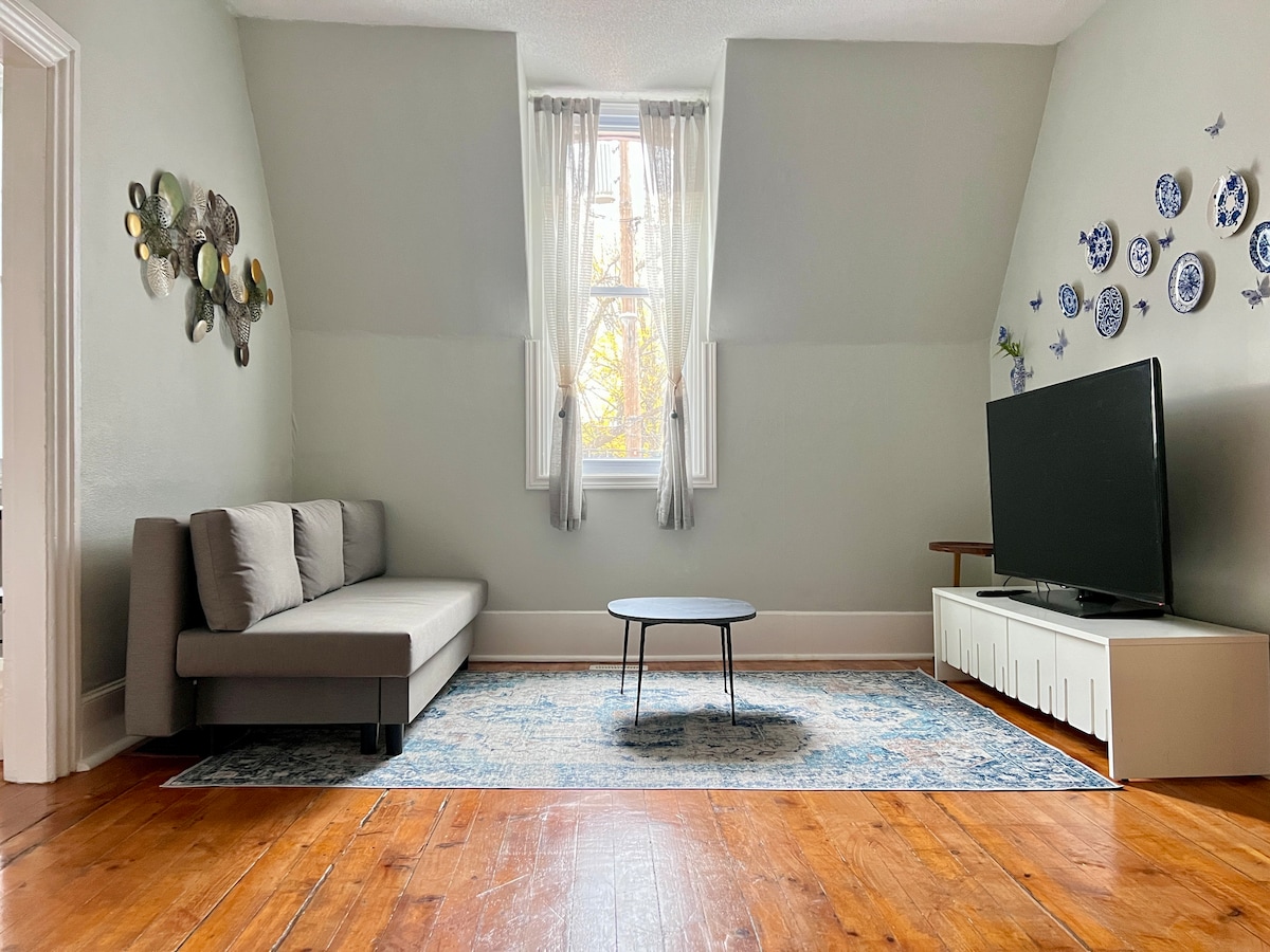 Experience a serene stay in our cozy 3rd-floor apartment, with views of the Tay River in historic Perth. Unwind in modern comfort amidst heritage charm. Explore local attractions or relax on the deck of Coutts Cafe on the main floor. **Please note there are 3 flights of stairs which might be difficult to use for those with mobility concerns.** No designated parking but public parking lot adjacent to building. $1.50/hr from 9:00-5:00 weekdays - no overnight charge and free on weekends.
