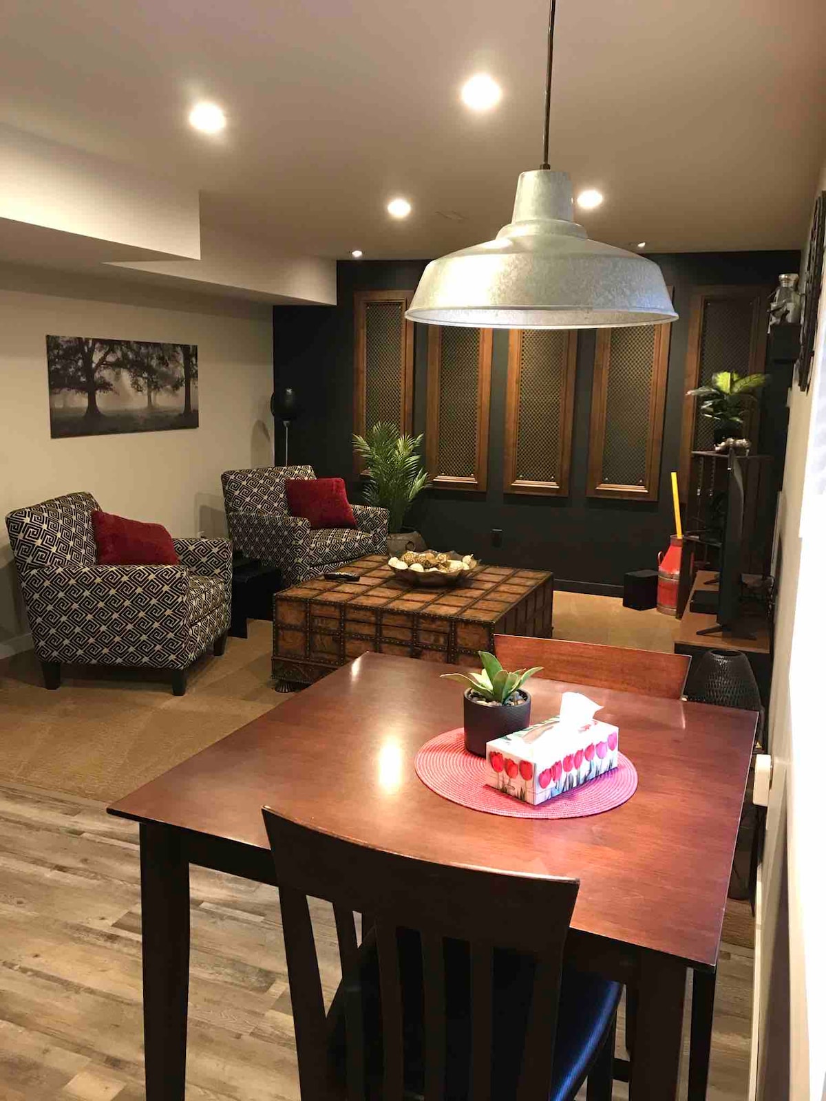 Suite de 830 pies cuadrados en el sótano, patio privado orientado al sur, cocina moderna, cómoda cama tamaño king y colchón tamaño queen portátil e inflable. ¡La unidad se mantiene fresca en verano y puede estar caliente en invierno con la chimenea de gas! Barrio familiar más nuevo. Internet rápido con TV por cable, independiente con amplia insonorización en todos los techos y pared divisoria, limpio, tranquilo y privado.