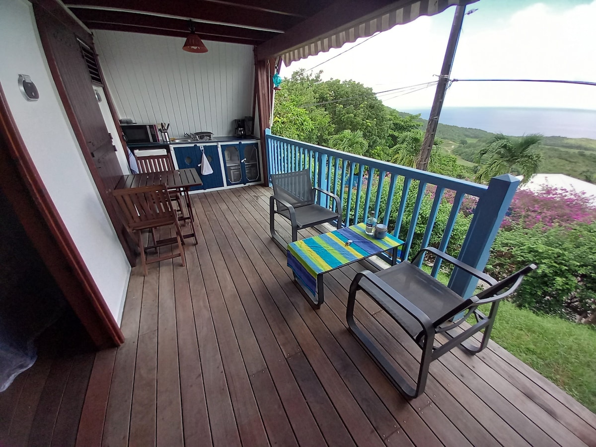 Turtle Bay Locations Grande Anse - Martinique Mini Villa T1 en hauteur offrant une vue panoramique sur la mer et la campagne. Accès mer à 50m à pieds. Plage connue pour ses nombreuses tortues vertes visibles en palme masque tubas toute l’année. Composée d’une chambre climatisée avec moustiquaire, une salle de douche avec WC, une cuisine équipée sur la terrasse couverte et une piscine privée de 2m*3m sur la terrasse découverte. Restaurant TiSable à 50m et petits commerces à 500m.