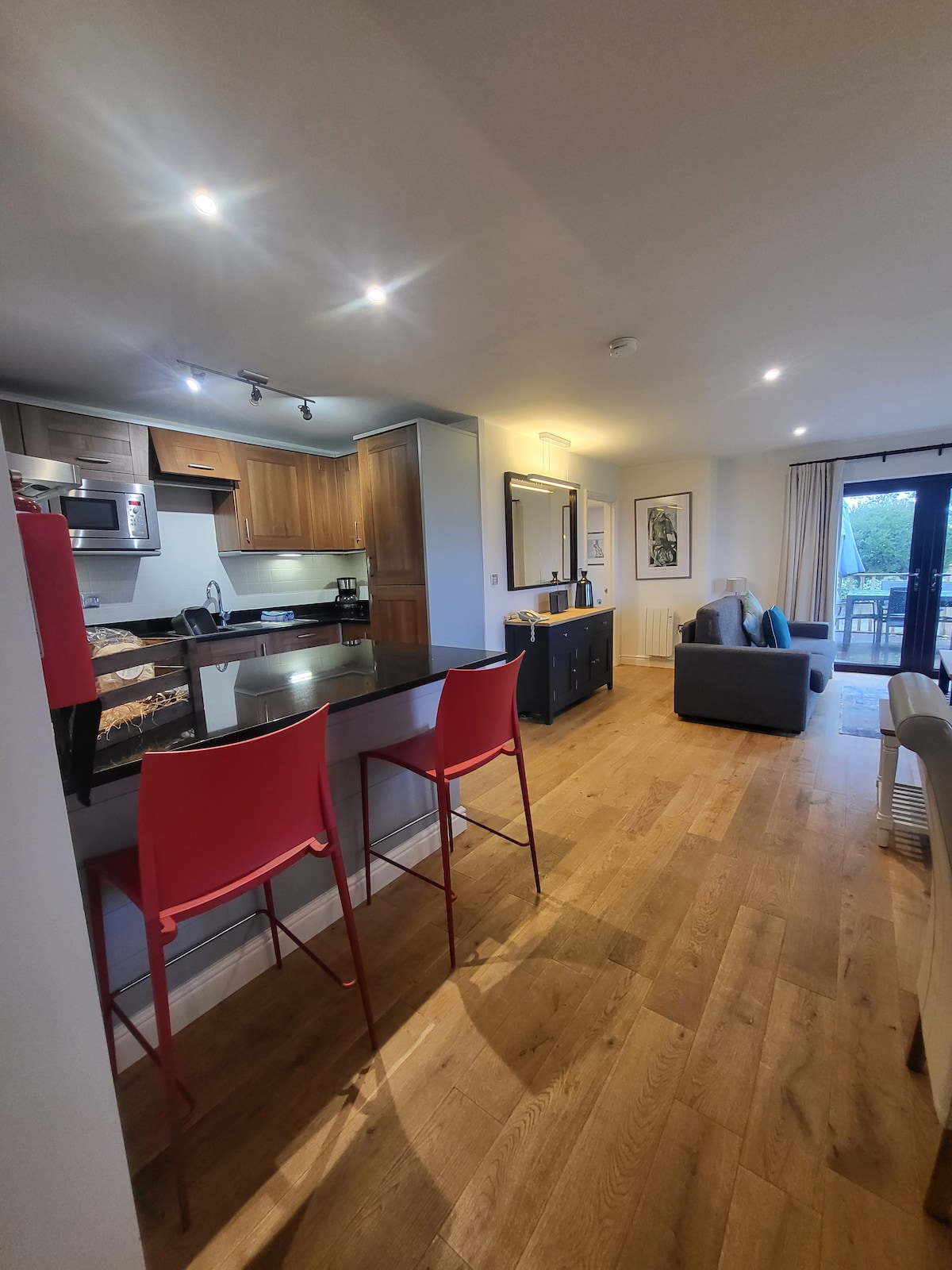 Treetops es un encantador apartamento moderno de primera planta recientemente renovado con dos dormitorios. El apartamento tiene una cocina de planta abierta, comedor y sala de estar, ¡por lo que es perfecto para familias con niños y perros! El apartamento está a un minuto a pie del aparcamiento principal, donde puedes coger el autobús local de la ciudad, o a cinco minutos a pie por la colina hasta la calle principal. La cocina está totalmente equipada con lavavajillas, nevera con congelador, horno y microondas. ¡La lavadora se encuentra en la dependencia del jardín!