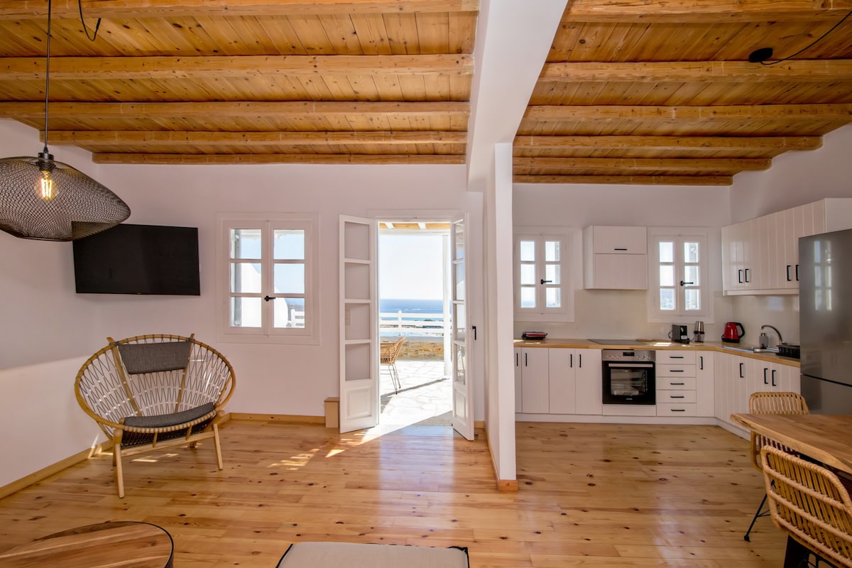 Step into a uniquely revisioned traditional Cycladic home perched at the edge of Ktikados village. Drop your bags, sweep open the double doors leading to the patio and settle in to an amphitheatrical view of mountain and sea! The property consists of a series of terraces ideal for al fresco dining, lounging, and unparalleled sunset views. During the day you can expect fly-bys by the local crows unique to the island and after the sun sets, moonlit visits from the valley sheep.