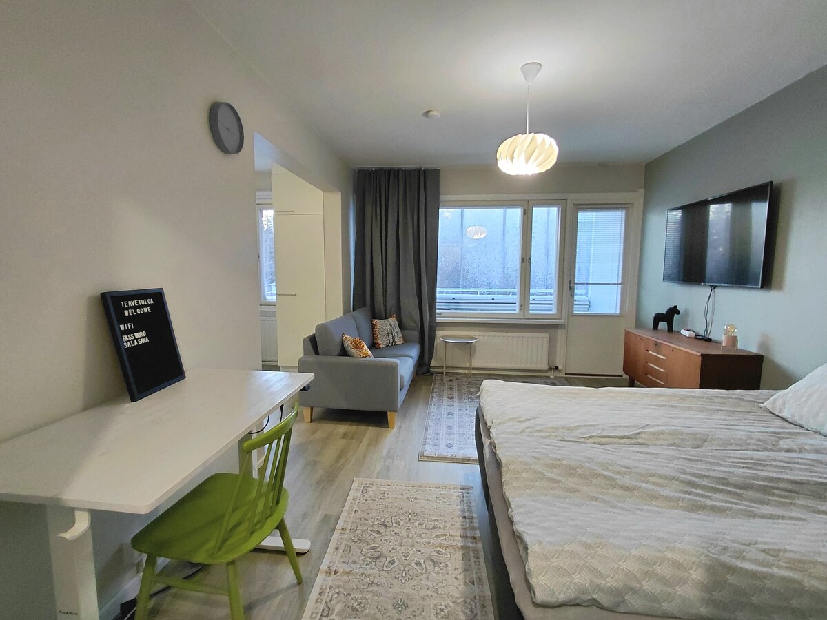Le damos la bienvenida a un apartamento con un ambiente cálido, que forma parte de un antiguo edificio de madera. La casa está situada en Kaukaa, bajo las chimeneas de la fábrica de papel. El apartamento es pequeño, pero compacto y tiene todo lo necesario. Se puede aparcar el coche en el patio de forma gratuita y el autobús pasa justo al lado. El barrio es agradable y tranquilo. Bienvenido. Estudio cálido y acogedor con dos camas individuales, cocina encantadora y baño con ducha. En una ubicación a poca distancia en coche de la hermosa ciudad y el puerto de Lappeenranta.