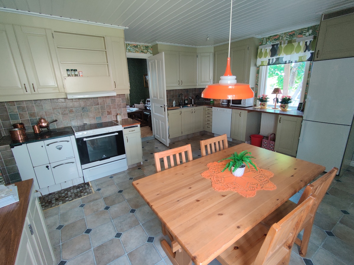 Lantligt stort hus på gård perfekt för den stora familjen eller semester med vänner. 8 vuxensängar plus en juniorsäng, max 12 år. Nyrenoverat badrum med tvätt och tumlare, övrigt i 70-talsstil framförallt på övervåningen. Fullt utrustat kök med mikro, spis/ugn, diskmaskin, kyl o frys. Två Tv-rum, WiFi o chromecast. Stor trädgård som delas med oss. Inglasat uterum, trädgårdsmöbler och grillmöjlighet. Vi bor alldeles intill. Sänglinne ingår inte, ta med själv. Vi har några hönor o tupp.
