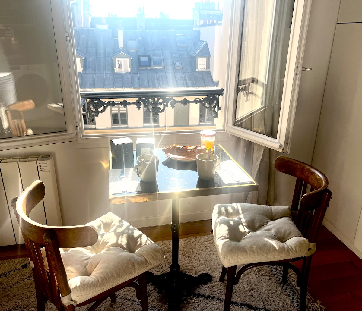 Above the rooftops of Paris, on Montmartre hill, for romantics visiting the city. Built in 1885, a 57m² (614 sf) duplex, on the 5th floor, no elevator--but the FAIRYTALE VIEW makes up for it! Unique, sunny, original parisian apartment. Tastefully and comfortably furnished. On a quiet side street, you'll sleep very well. ★Enjoy the real live of a Parisian from Montmartre! ★Sacré-Coeur Basilica - 8 min' away, ★Amelie Poulain’s Café, ★Moulin Rouge - 5 min'.