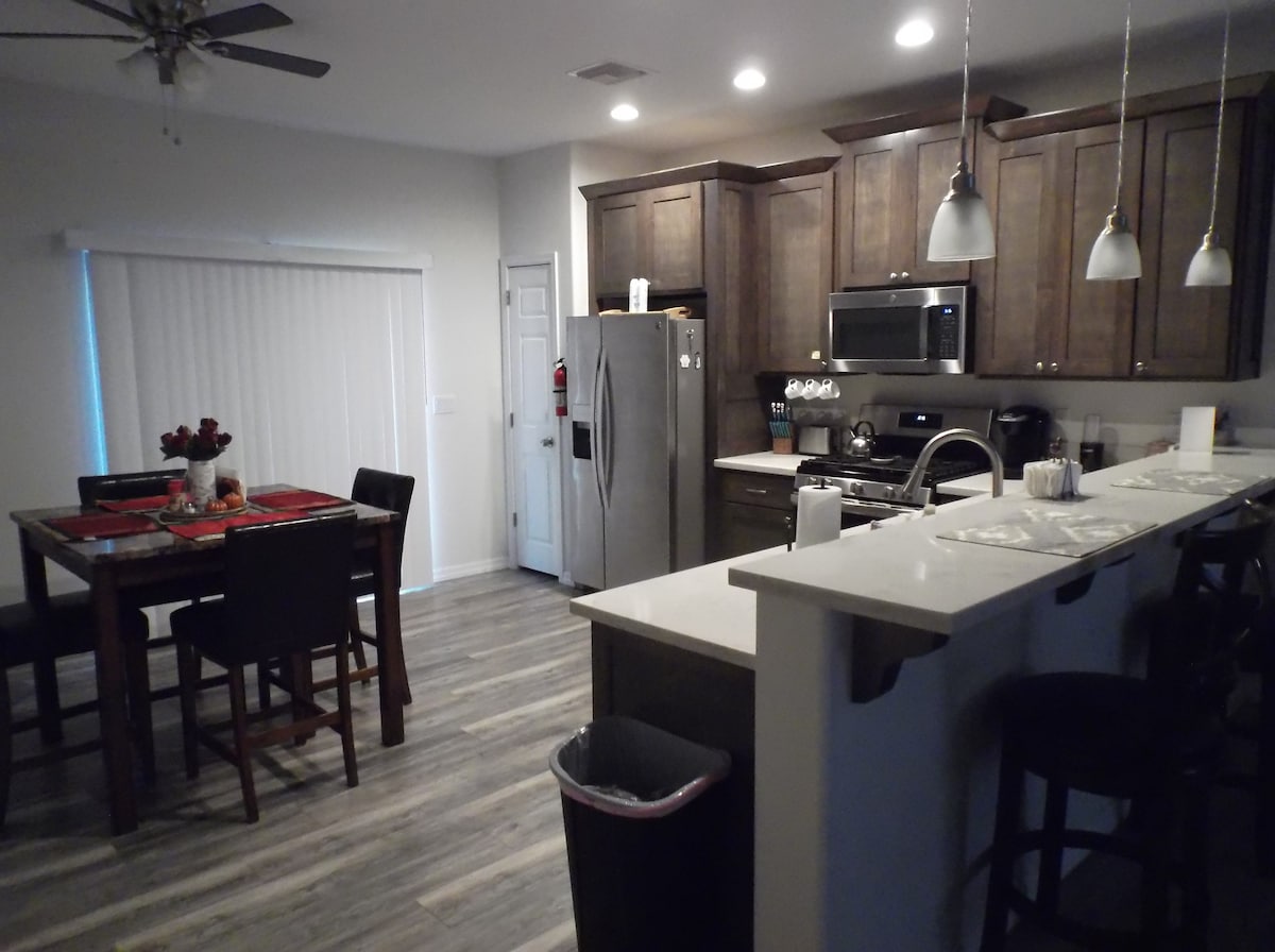 Gran casa moderna con un oasis privado en el desierto: pasa un fin de semana relajante alrededor de la piscina o disfruta de una reunión familiar en el gran patio trasero bellamente ajardinado. Shuffleboard, ping pong, mesa de billar y mucho más, este alojamiento tiene todo lo que necesitas. Esta casa cuenta con un garaje profundo para botes de 3 autos, por lo que hay mucho espacio para estacionar y almacenar tus juguetes acuáticos o del desierto. También hay una entrada extra larga a lo largo del lateral derecho de la casa para estacionamiento adicional. Se admiten mascotas. Consulta para grandes reuniones.