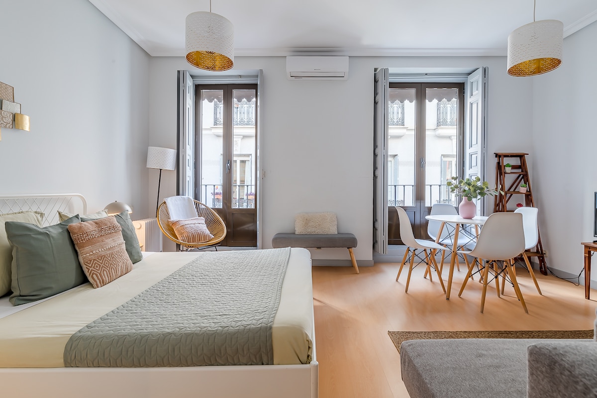 ALQUILER DE CORTA ESTANCIA Magnífico apartamento de 45 metros cuadrados en todo el centro de Madrid. Con un diseño y decoración espectacular, espacios amplios y techos altos, el apartamento está equipado con todo lo que necesitas para tu estancia en Madrid. El salón tiene tres balcones a la calle que aportan una gran luminosidad al piso. El dormitorio tiene el baño en-suite y un escritorio de trabajo. Desde el apartamento podrás visitar andando casi todos los puntos emblemáticos de Madrid.