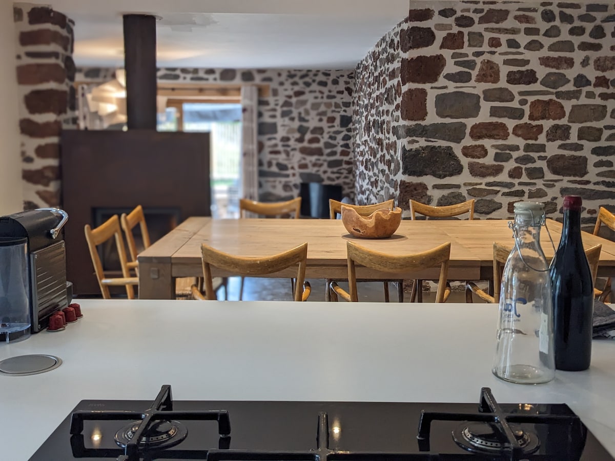 Aquí, cada detalle está pensado para que se encuentre con amigos o familiares. Este antiguo establo renovado con materiales locales y un toque de elegancia moderna, es ese lugar excepcional donde uno se siente como en casa, pero mejor. Los amplios espacios (4 dormitorios, sala de estar acogedora, terraza soleada) y las instalaciones de alta gama (cocina ultraequipada, ropa de cama premium, estufa de leña) están diseñados para que pase momentos inolvidables: cena en la terraza con vistas a las colinas, juegos de noche
