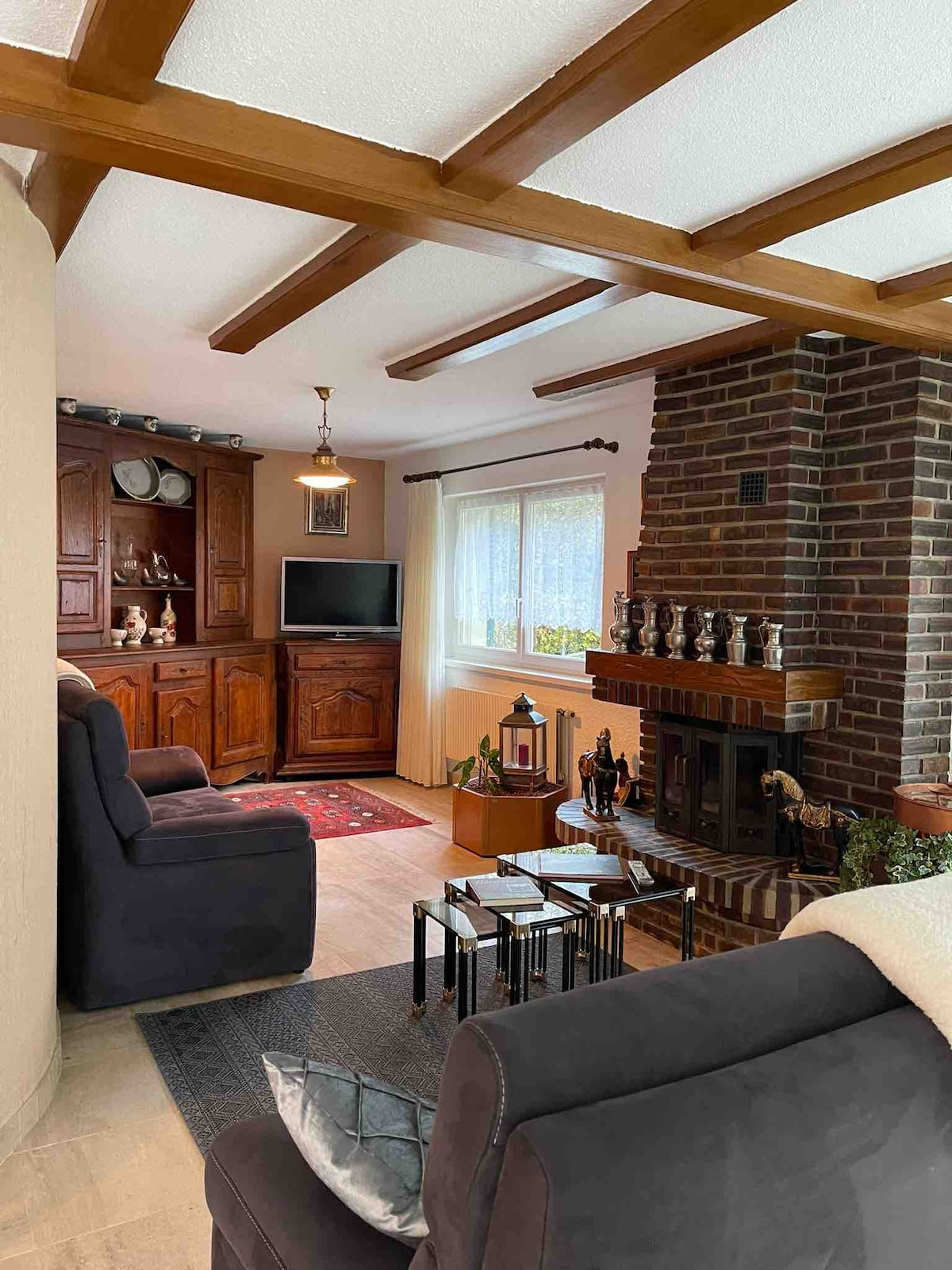 totalmente reformado de 170 m2 4 habitaciones: (3 habitaciones con cama doble, 2 de ellas con TV) (1 habitación con cama doble y dos camas individuales y TV) 2 baños con ducha, uno con bañera y ducha y el otro con ducha y aseo en la entrada Cocina abierta al salón totalmente equipada para 10 personas (Cafetera y té Nespresso, tostadora, ollas de fondue, horno de raclette...) Calefacción por suelo radiante, chimenea Plazas de aparcamiento Parcela de 20 000 m² de bosque, pradera y césped