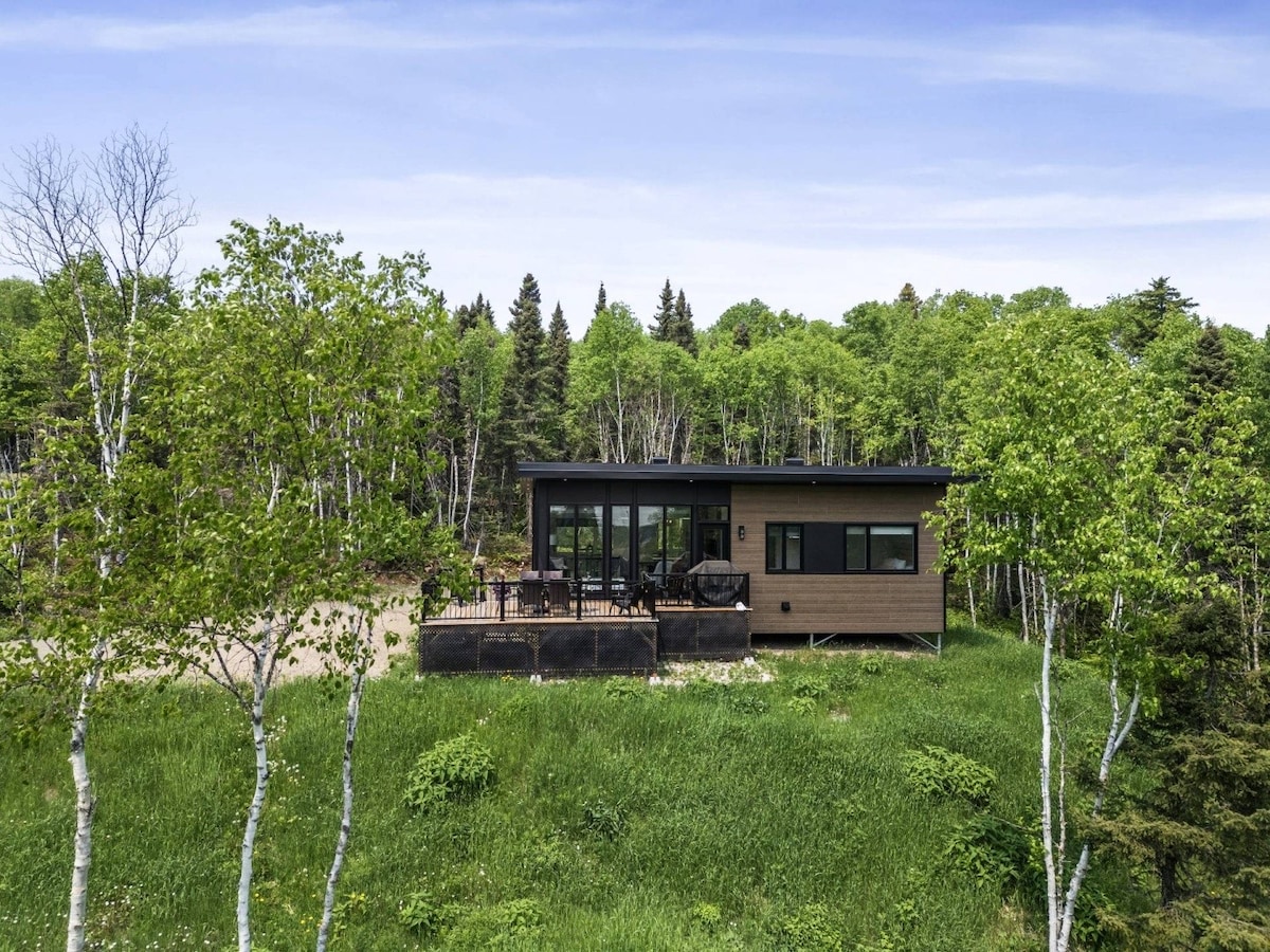 Small Scandinavian chalet for two people ideally located to enjoy the attractions of Charlevoix. It has a thermal circuit (hot tub, sauna, hammam) Very intimate and in the middle of the woods, the view overlooks the majestic river and the mountains in the distance. All the modern equipment is there and the comfort is absolute A/C and outdoor fireplace. The open concept design was designed for an immersive experience in nature: large windows, panoramic shower. Access via a private road at 500 m.