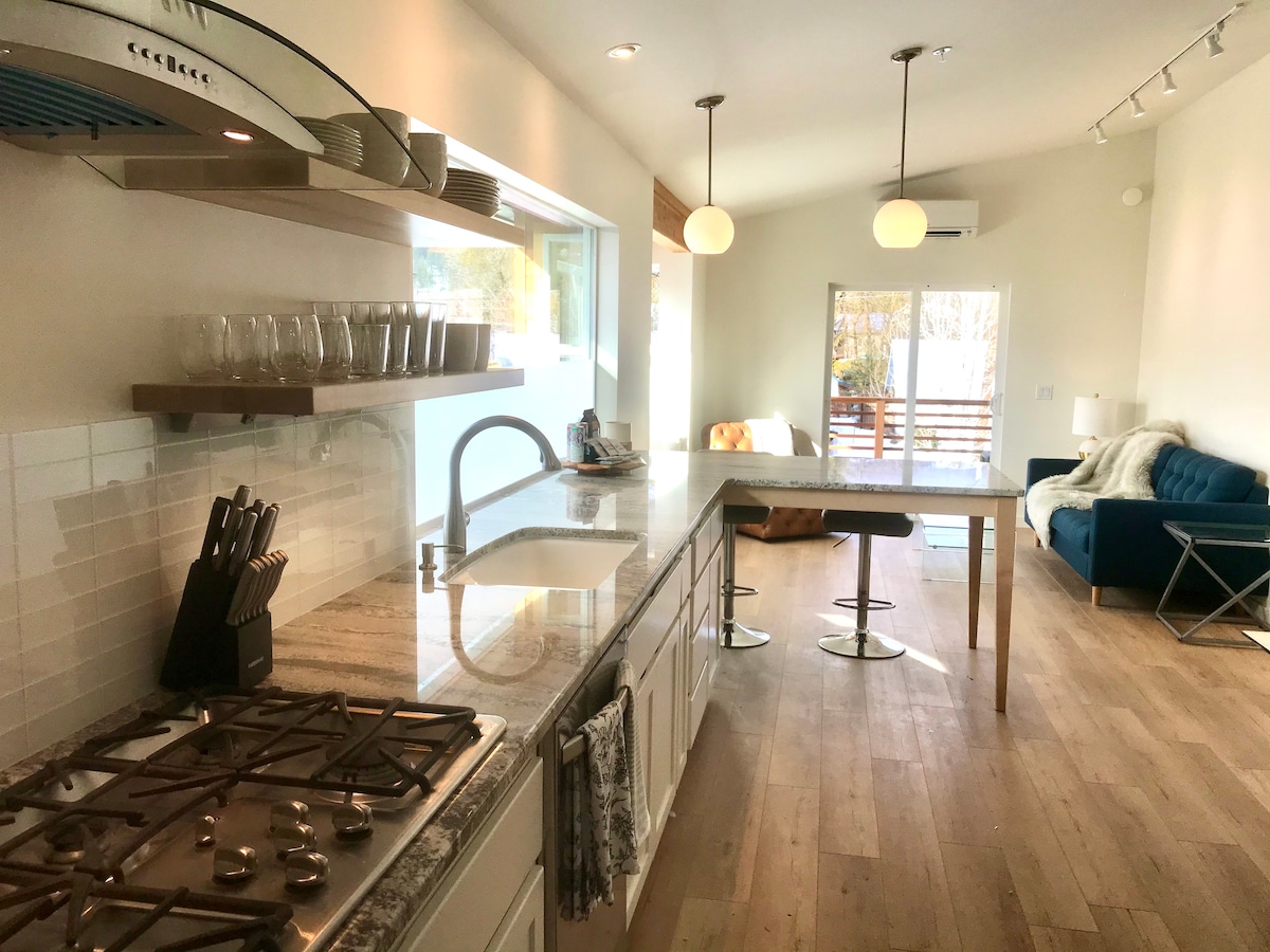 Un refugio privado tipo spa en un barrio tranquilo a tres manzanas del centro de la ciudad. Diseñado pensando en la relajación: ducha doble y baño de vapor completo, aceites esenciales, bancos de teca; dos bancos de ventana para estirarse con un libro; y un gran balcón en el segundo piso para respirar el aire fresco de la montaña con tu café de la mañana. Acabados de granito, cuarzo y arce; techos abovedados y vistas a la montaña. Un verdadero oasis de tranquilidad. UBI n.º 604 130 4-thirty-2