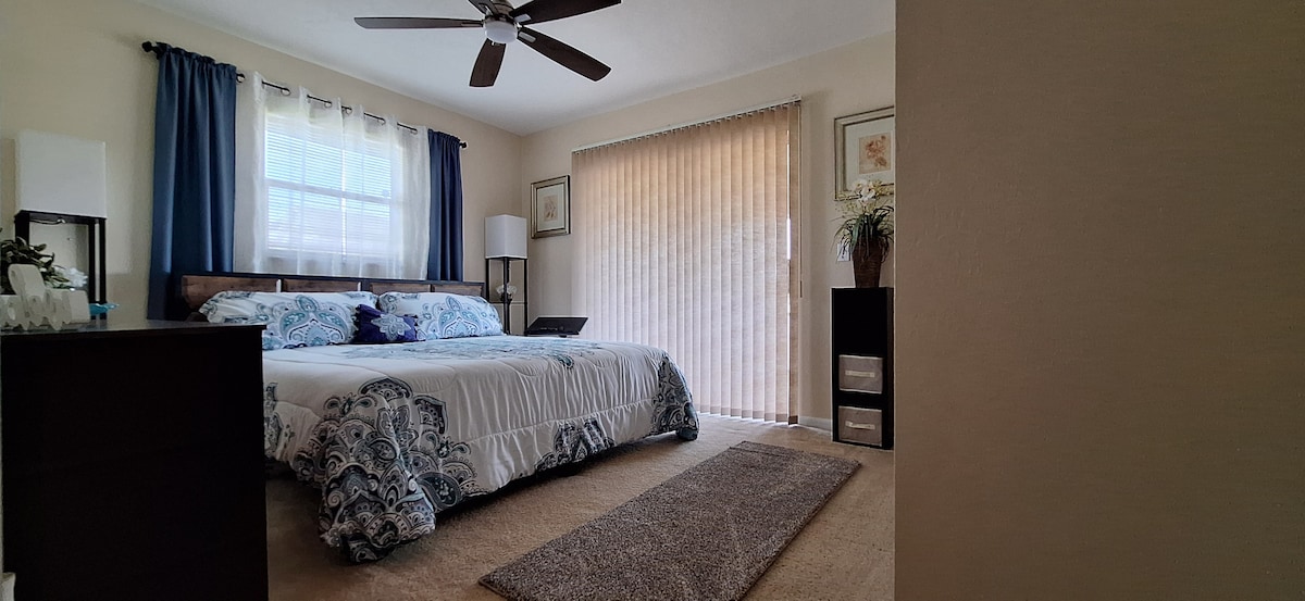 Este apartamento eficiente para NO FUMADORES tiene un cómodo colchón tamaño king firme con una cubierta de espuma. Derrite tu estrés mientras duermes. POR FAVOR, TENGA EN CUENTA QUE: La lavandería de los apartamentos se realiza semanalmente, pero la ropa personal se puede lavar en una lavandería local. Una pequeña zona de cocina (SIN FOGONES) con entrada privada en un barrio tranquilo y seguro. Cerca de tiendas, hospitales y otros lugares de Florida. El aire está ajustado a 77*
