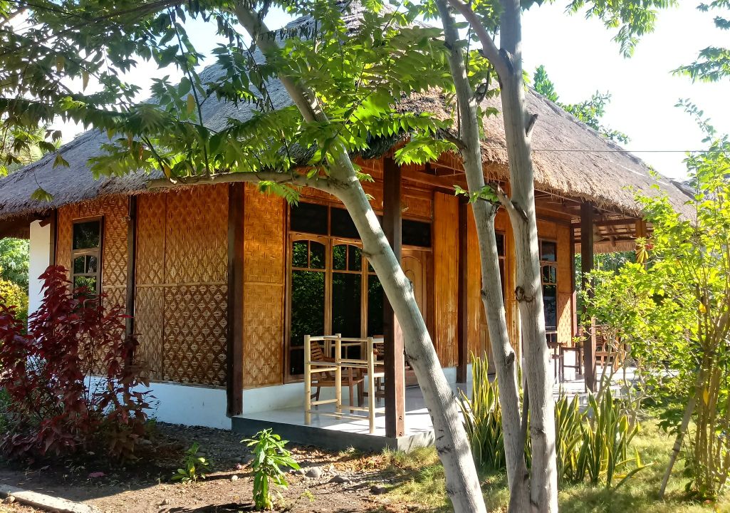 bungalows individuales ubicados en la playa, una antigua casa tradicional de madera de segunda mano de Flores combinada con el edificio de bambú Resto y el dormitorio. Gran jardín bajo los cocoteros